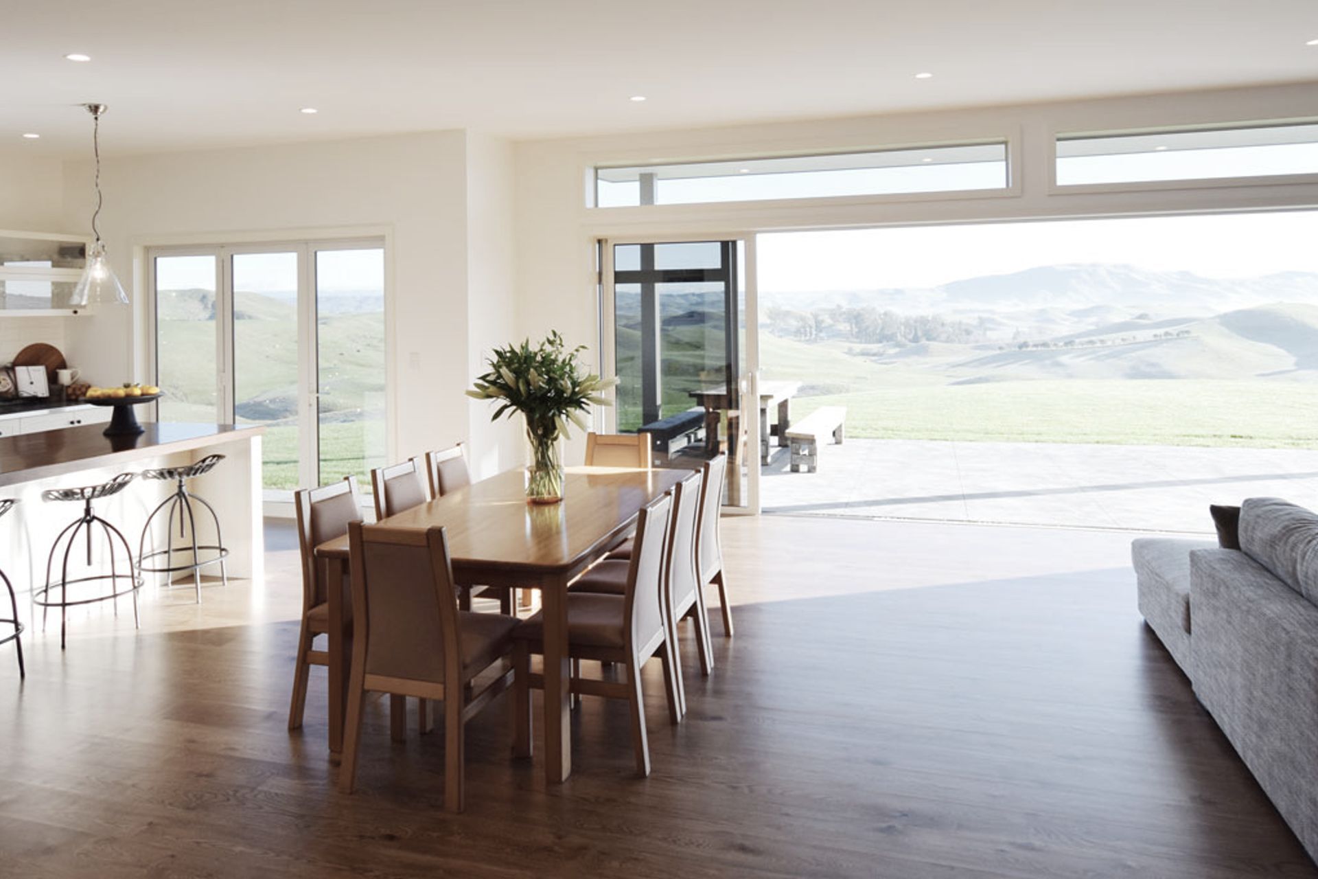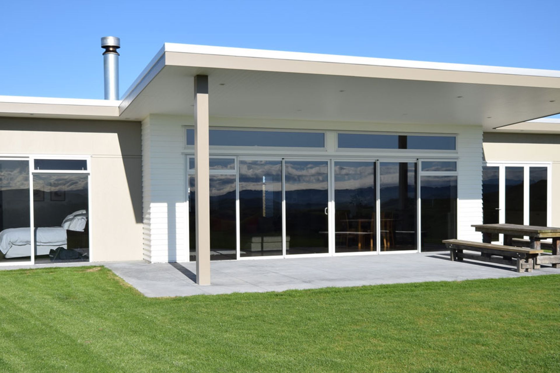 ArchiPro Project Summary - A stunning residence perched on a ridge, offering breathtaking views of the Tuki Tuki River, designed to maximize sunlight with solid timber flooring for warmth, featuring a shadow-clad exterior and Linea weatherboard.