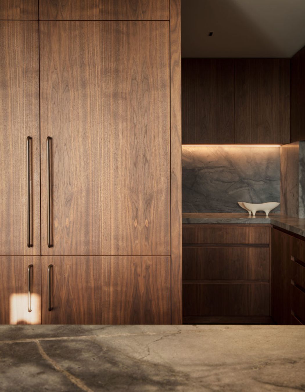 ArchiPro Project Summary - A stunning renovation of a 1960s Auckland apartment featuring Halliday & Baillie's aged brass pull handles on sleek white cupboards and elegant walnut cabinetry.