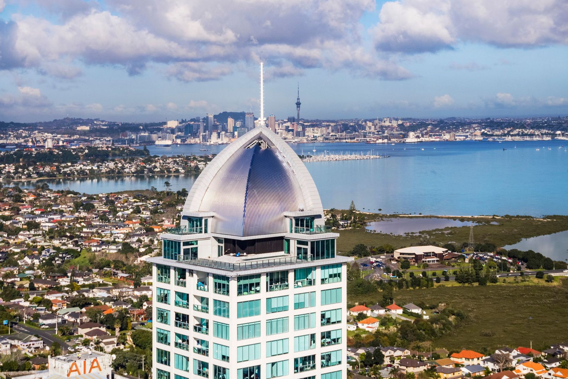 ArchiPro Project Summary - Stunning two-story penthouse at Sentinel Apartments, featuring 360-degree views of Auckland, North Shore, and Rangitoto Island, creatively staged by Juliette Yarrell Interiors, with photographic and film content produced by RE:SHOOT and Incredible Images.
