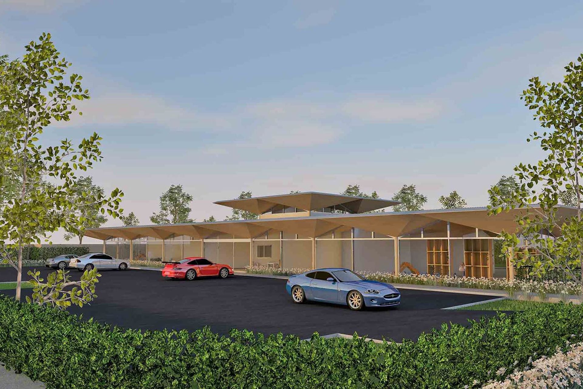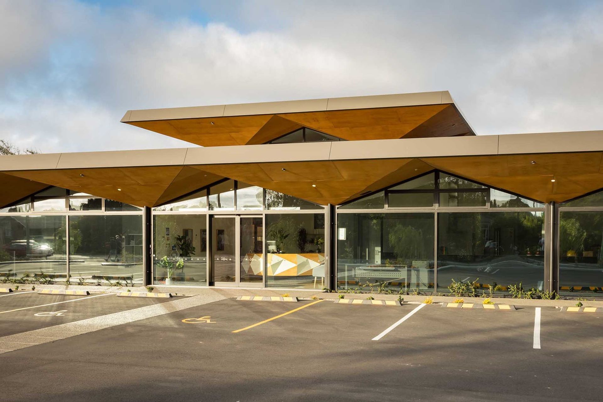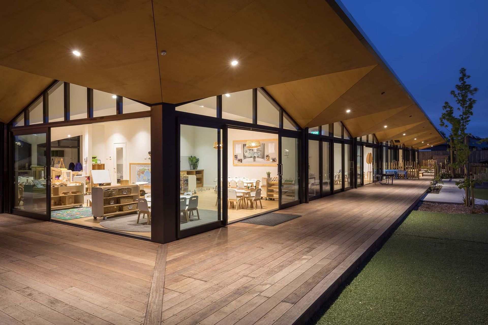 ArchiPro Project Summary - The Willows Early Learning Centre features a geometric roof resembling a tree canopy, with a functional timber frame design that maximizes natural light and integrates seamlessly with its outdoor playground, creating a welcoming environment for children and parents.