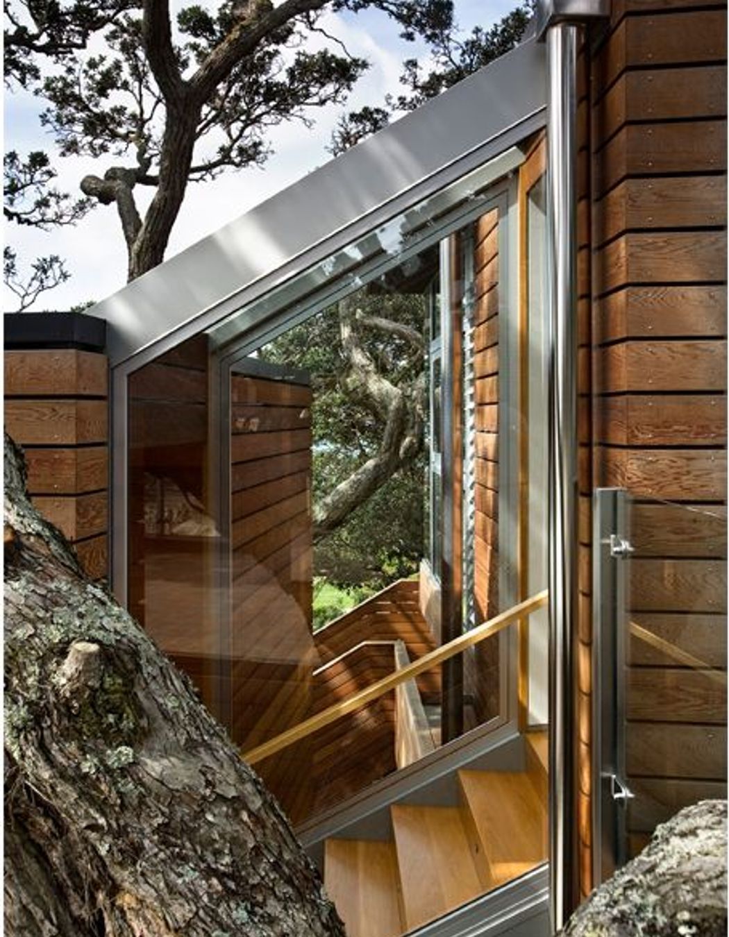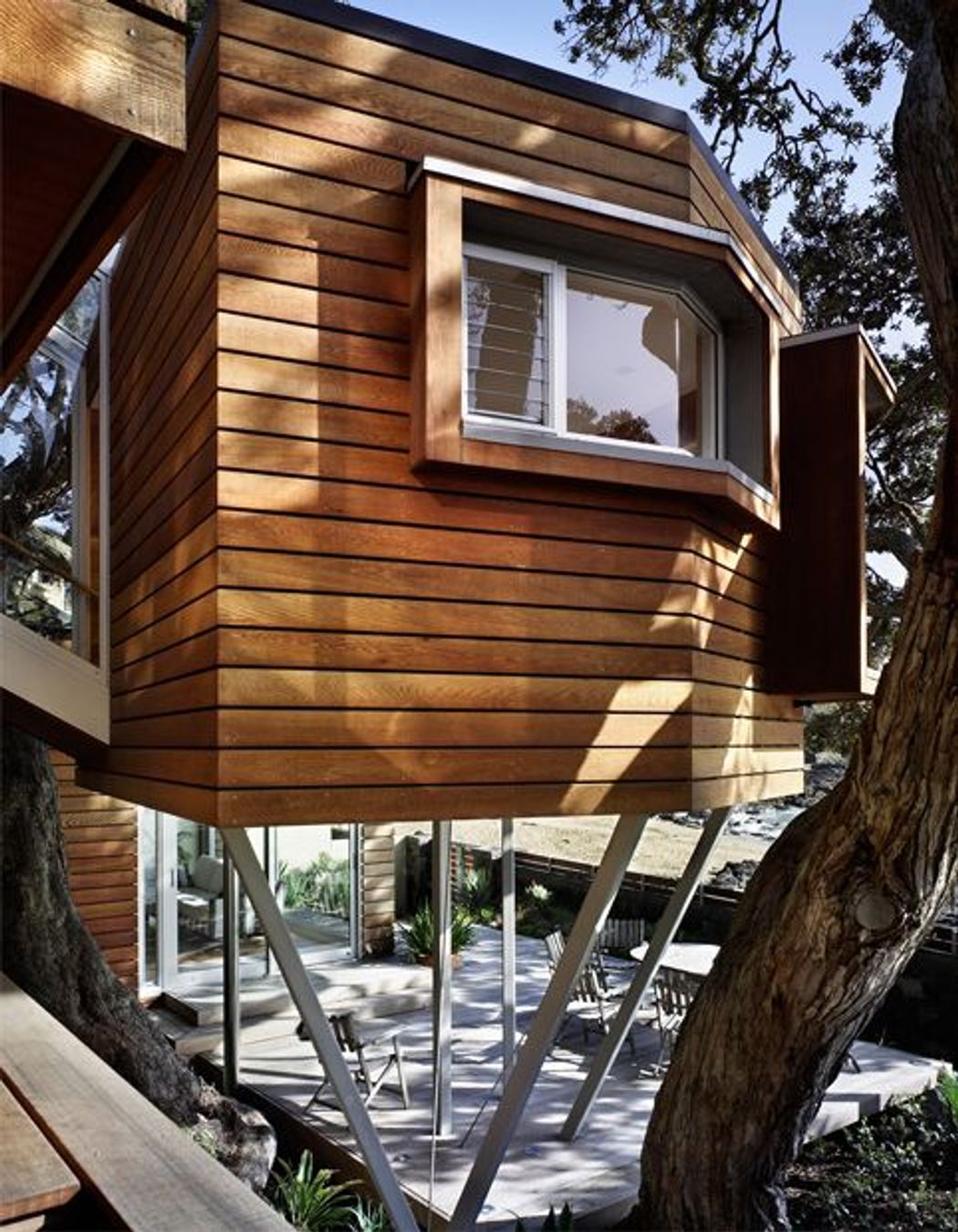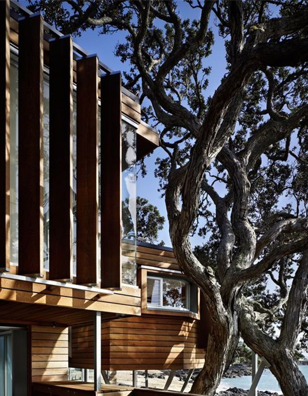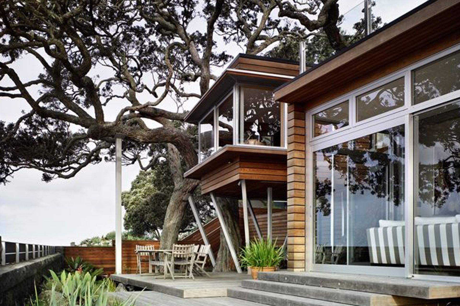 ArchiPro Project Summary - Innovative compact house seamlessly integrated into a challenging site, preserving five pohutukawa trees while maximizing views and sunlight, featuring a unique design that adapts to the landscape and includes a rooftop terrace among the branches.