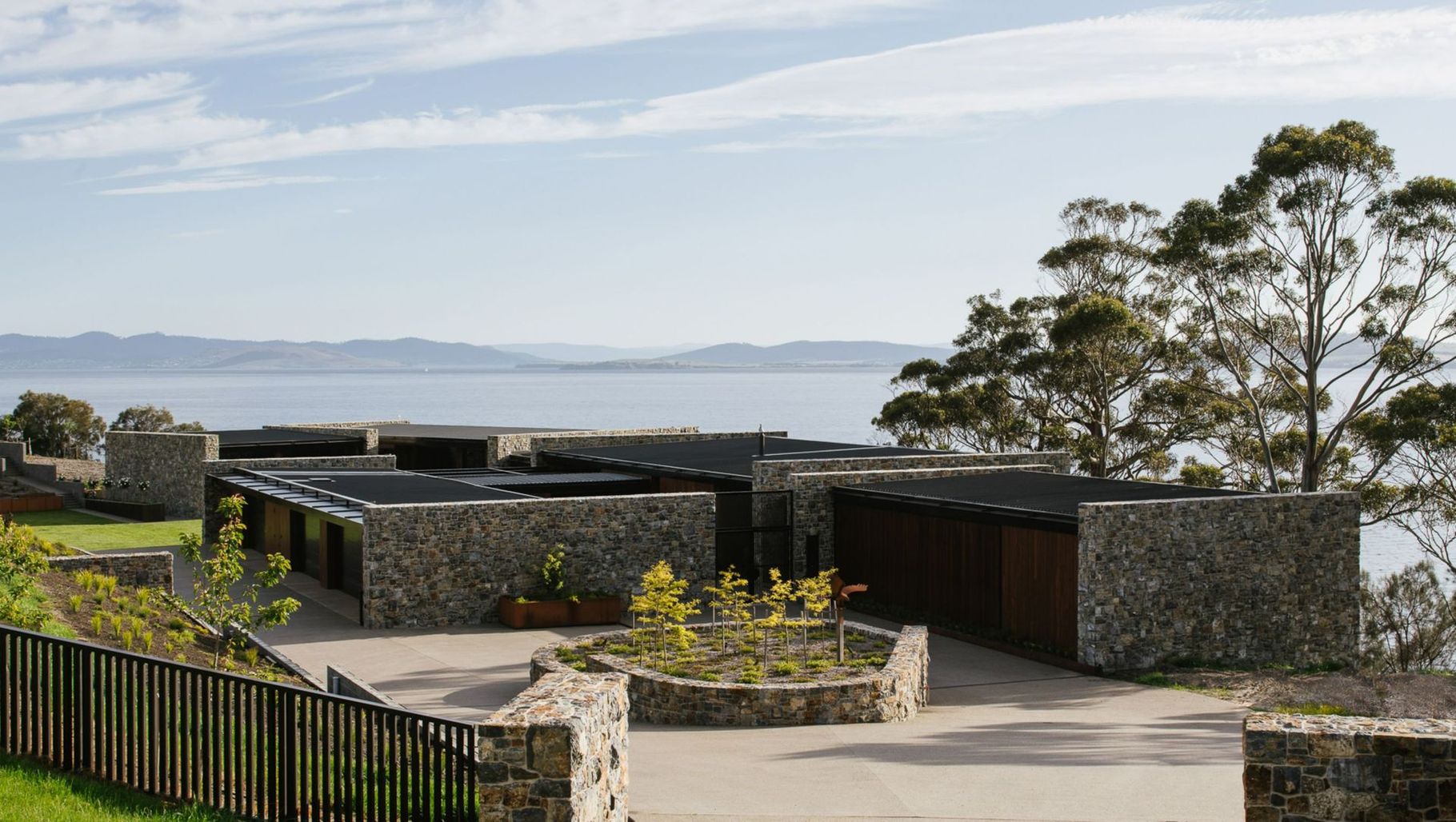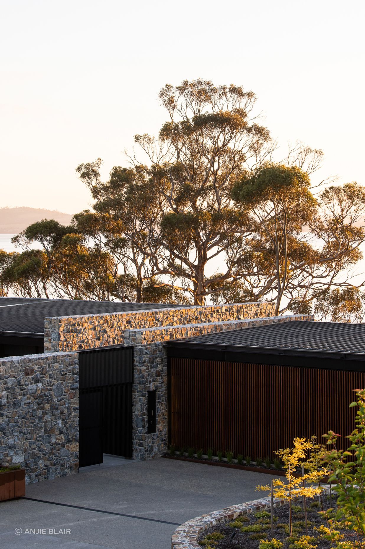 The client, architect and stonemason worked collaboratively to select a stone that was local and reflected the warm hues of the site’s landscape. Mudstone quickly emerged as a premium choice and is now the core material of the building. “The stone provides a consistent language throughout the building while emphasising the permanence and groundedness of the home,” says Kate. “We wanted to create a cohesive form with exterior materials that wrap into the interior, which has resulted in a low-lying profile that embraces the landscape and topography.”
