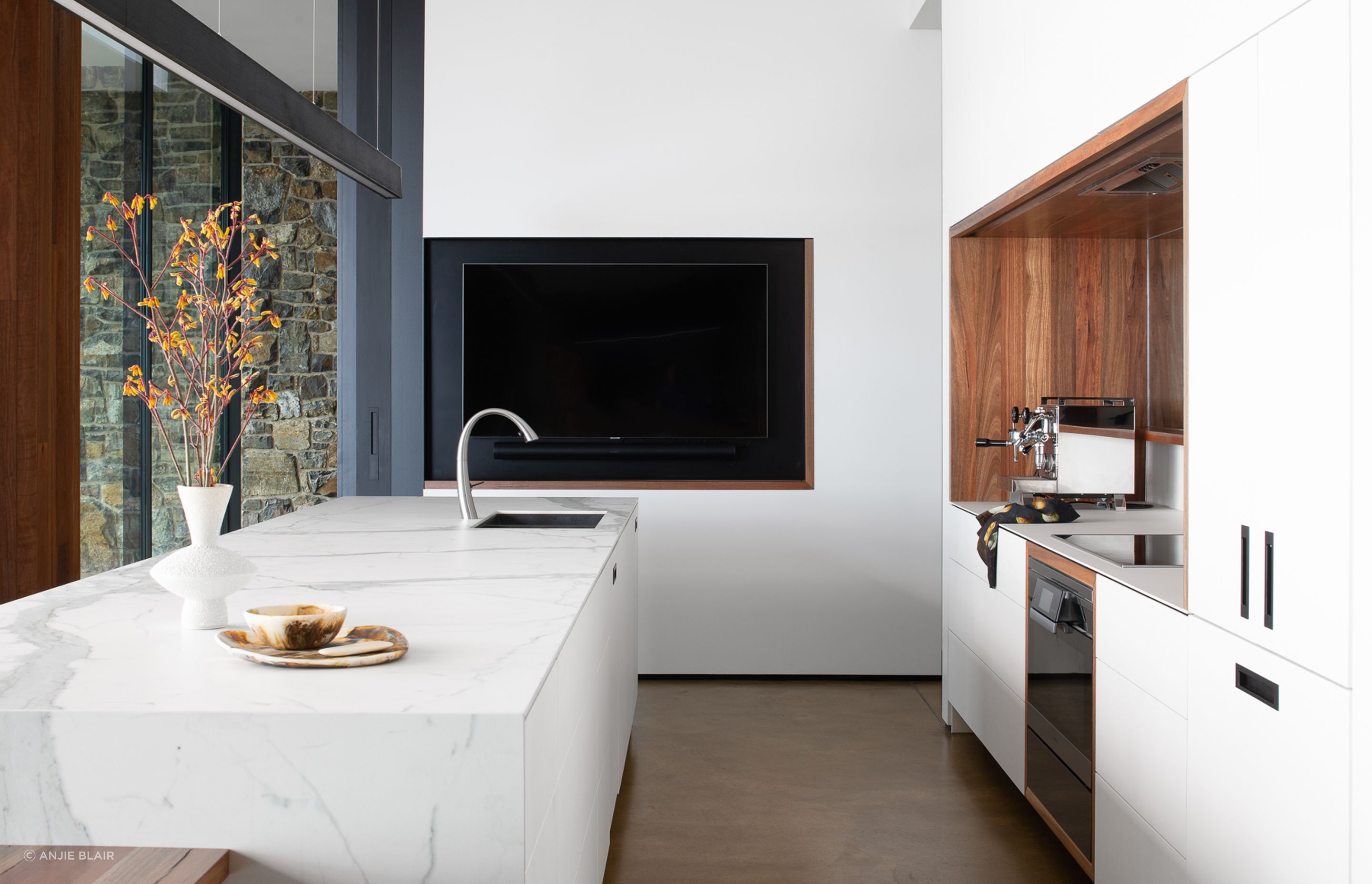 The colour of the stone informed the other materials used within the project, such as the warm caramel burnished concrete floors and ochre spotted gum cladding, which is also bushfire resistant. A restrained interior scheme takes cues from the nearby sea and cliffs, with prevalence given to natural materials across furnishings and homewares.