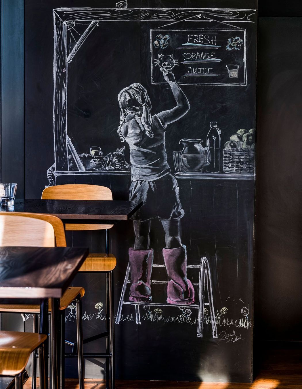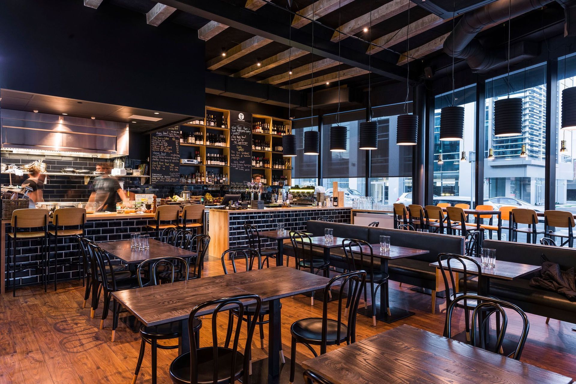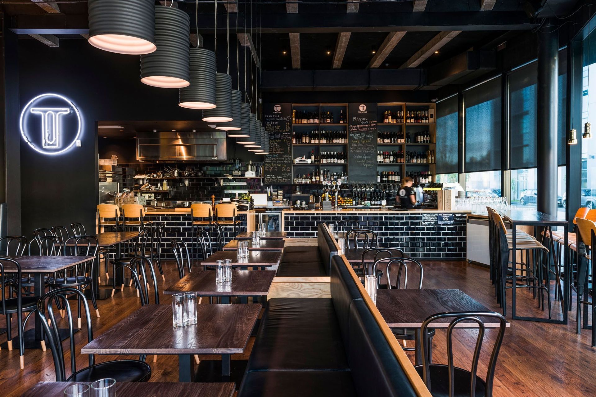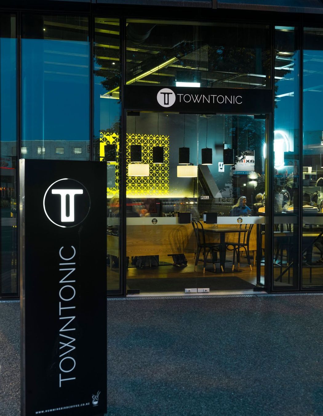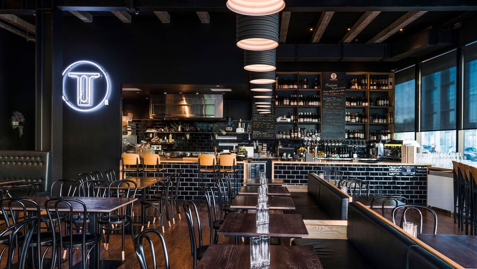 ArchiPro Project Summary - Town Tonic: A dynamic restaurant in Christchurch featuring a striking black interior, commissioned artwork, and custom-designed sofas that enhance the dining experience while addressing the challenges of a high stud height and compact floor area.