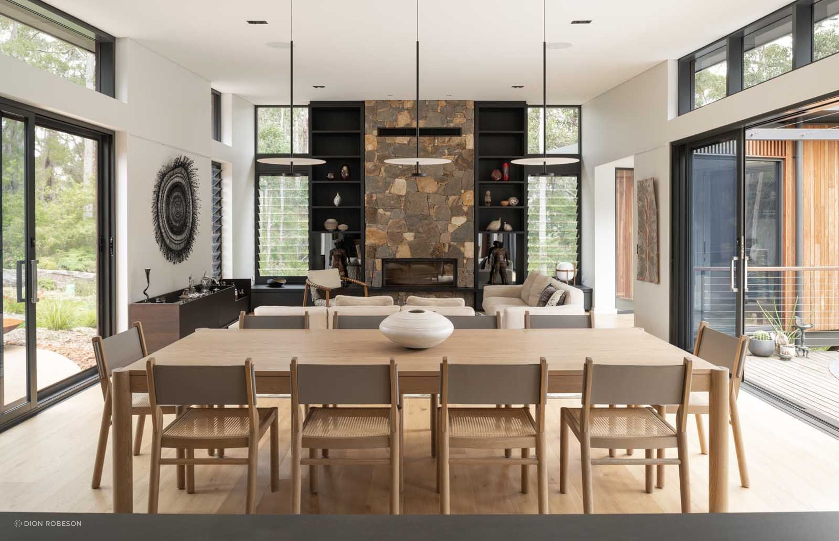 Navigating challenges such as fire ratings, local planning regulations, and environmental sensitivity required a mastermind capable of transforming constraints into opportunities. The architect's touch seamlessly integrated the landscape's majestic trees, cladding textures, and the stunning Axis H1400 wood fireplace from Sculpt Fireplace Collection, into a symphony of design, creating a living masterpiece that stands as a testament to the pivotal role of architectural vision.