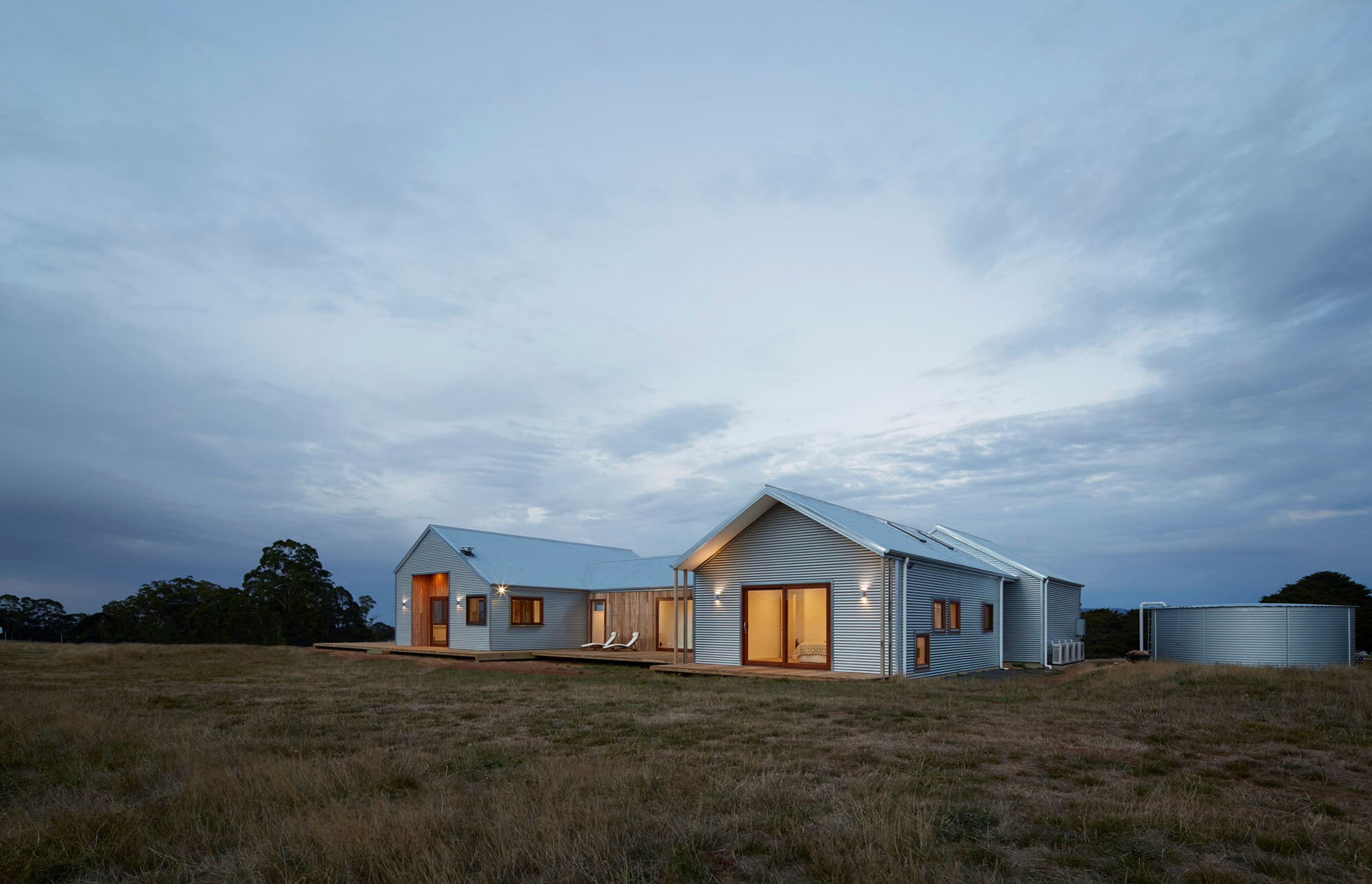 Environmental Efficiency - The house is located in one of the highest rainfall regions in the state of Victoria. The roof was pitched to allow this rainfall to be collected efficiently through a wet system to various tanks making the house self supportive and included the allowance for firefighting. The house is double stud walled (except the garage) to allow a huge amount of additional insulation to be provided. This and the roof-space area allowed the house to be very well insulated, with reduced risk of this leading to condensation issues through use of breathable sarking and additional external air barriers and insulation to roofing to have less thermal differentiation between outside and in which leads to condensation. To the Northern wall the use of reverse brick veneer allows the walls inner thermal mass to take in the heat of the day, and give it back of a cooler evening balancing the temperature. Additional thermal mass is produced through the polished concrete insulated slab. Awnings control the light which hits the slab by using awnings pitched to allow winter sun, and exclude direct summer sun. The windows are double and triple glazed. When heating is required this comes from heat exchange units to radiator panels throughout the house. Fire resistance comes from using re honed fire resistant Black-butt timber. The beams are recycled timber from a school house. Corrugated galvanised steel was chosen not only to give low maintenance, but also assists in reflecting heat. Heat is not conducted into the building from it due to air gap behind the steel. The land has 270 Eucalypt Acacias planted thus far. Local stonemason employed working with local Castlemaine rock for chimney. Timber frame prefabricated in factory allowing offcuts to be reused in afactory setting and more controlled build. Water-saving toilets, shower heads and appliances.