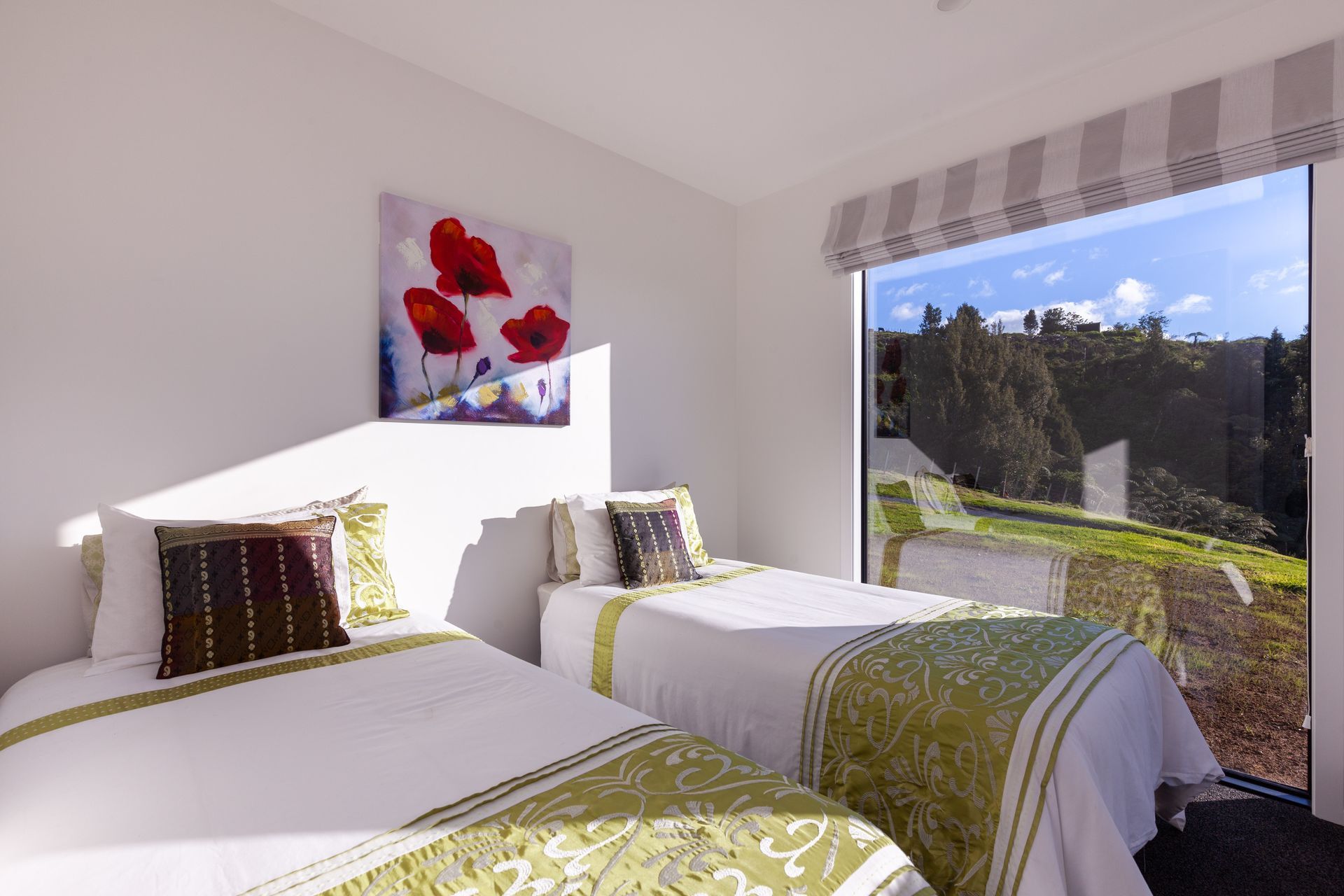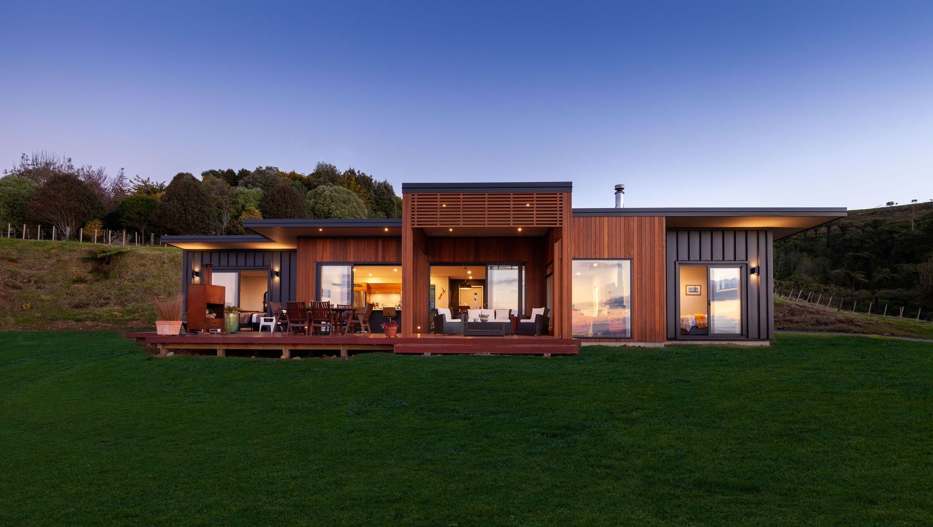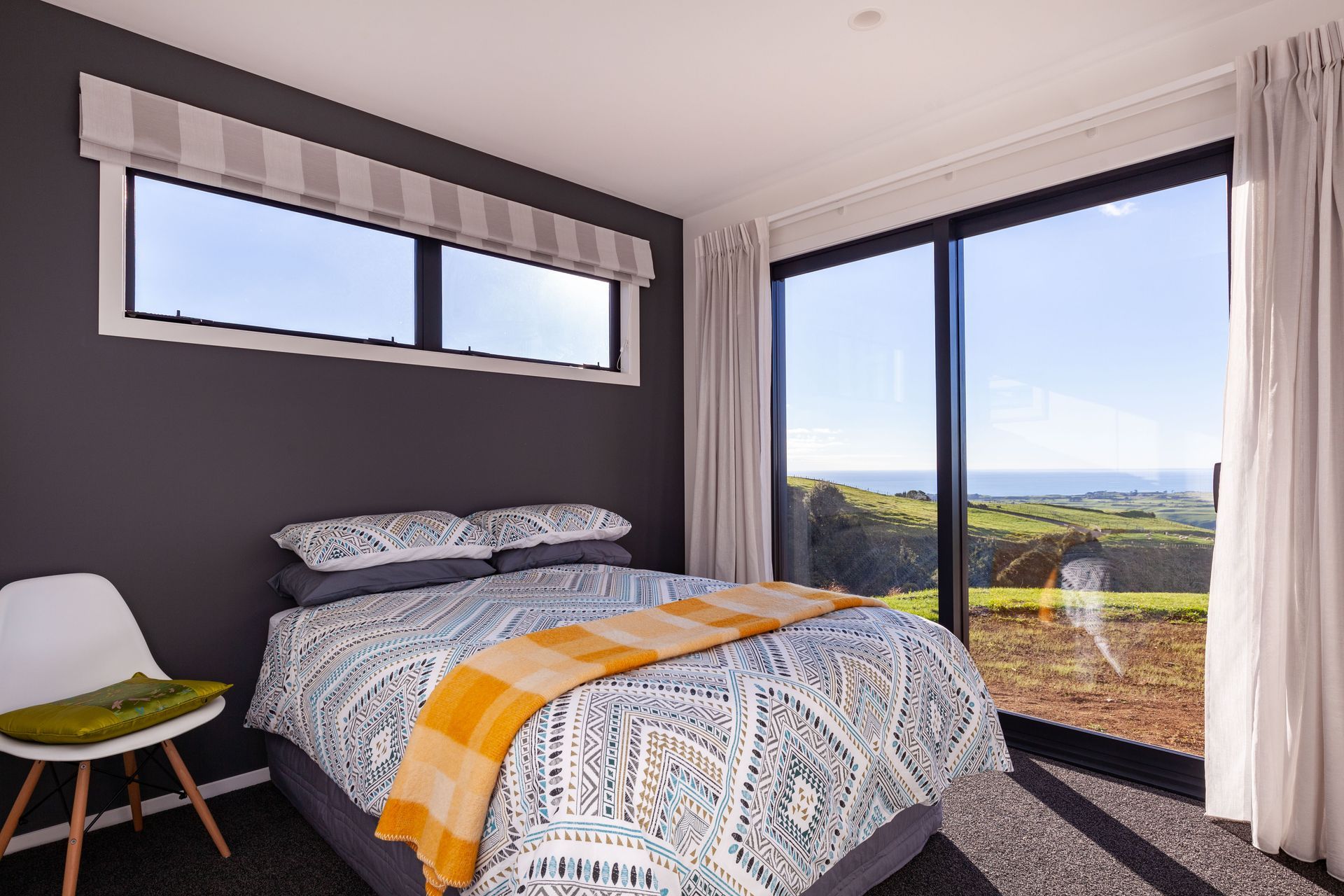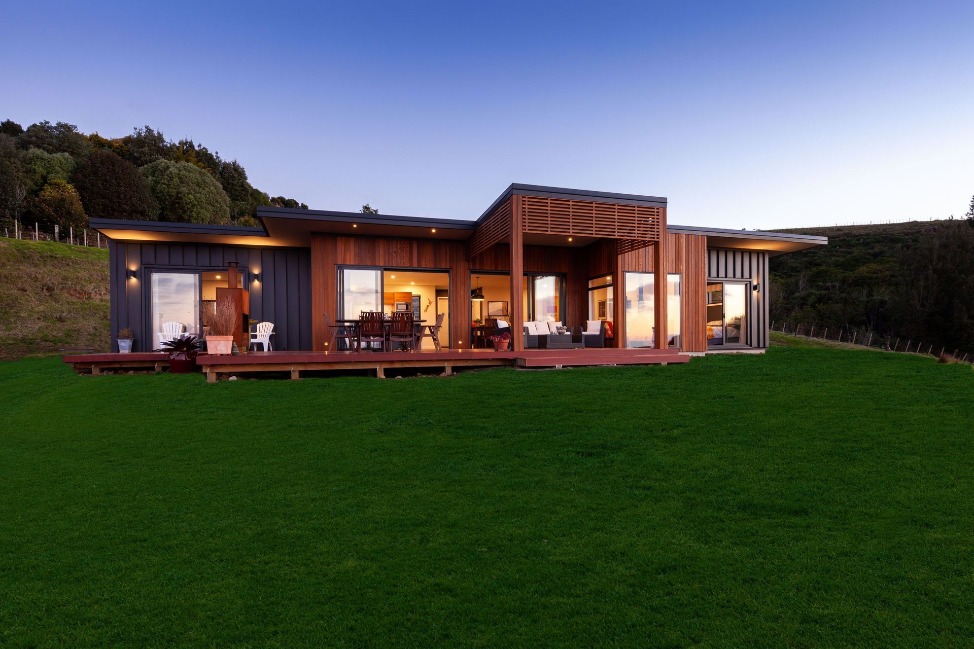 ArchiPro Project Summary - Troon: A stunning home in the Taranaki Hills, featuring open-plan living, a modern kitchen with scullery, and breathtaking sea views from spacious decks, all while maximizing natural light through expansive windows and sliding doors.