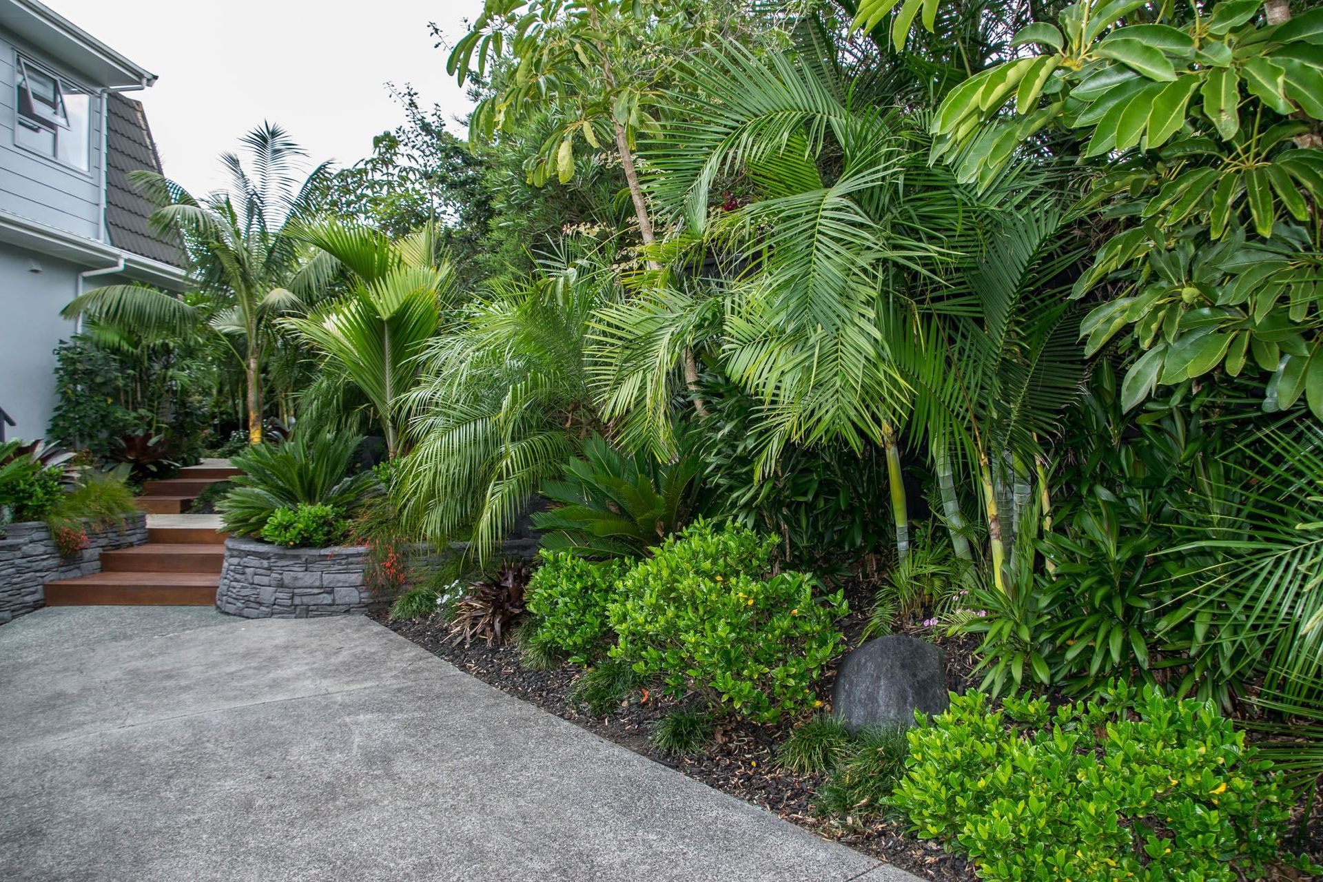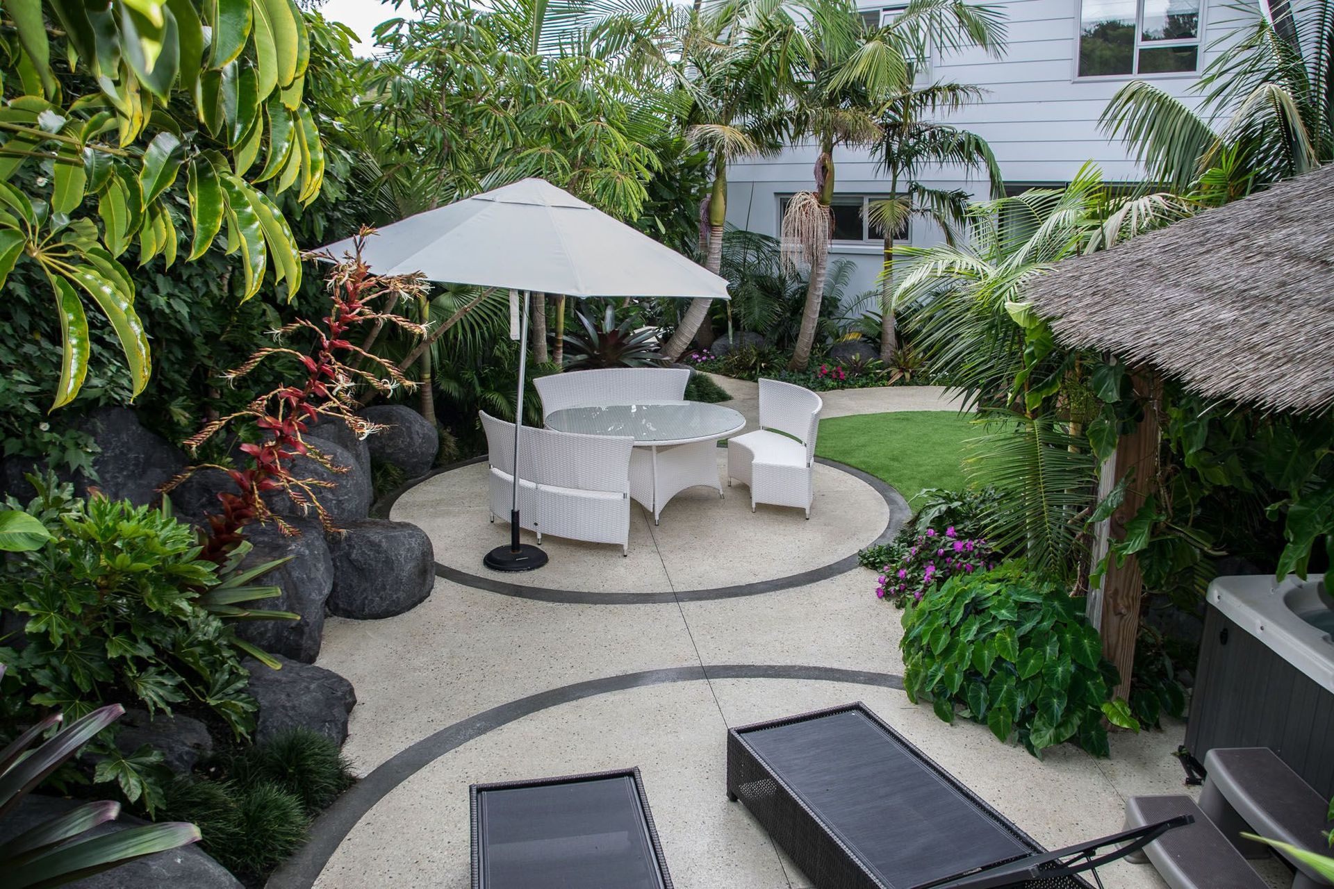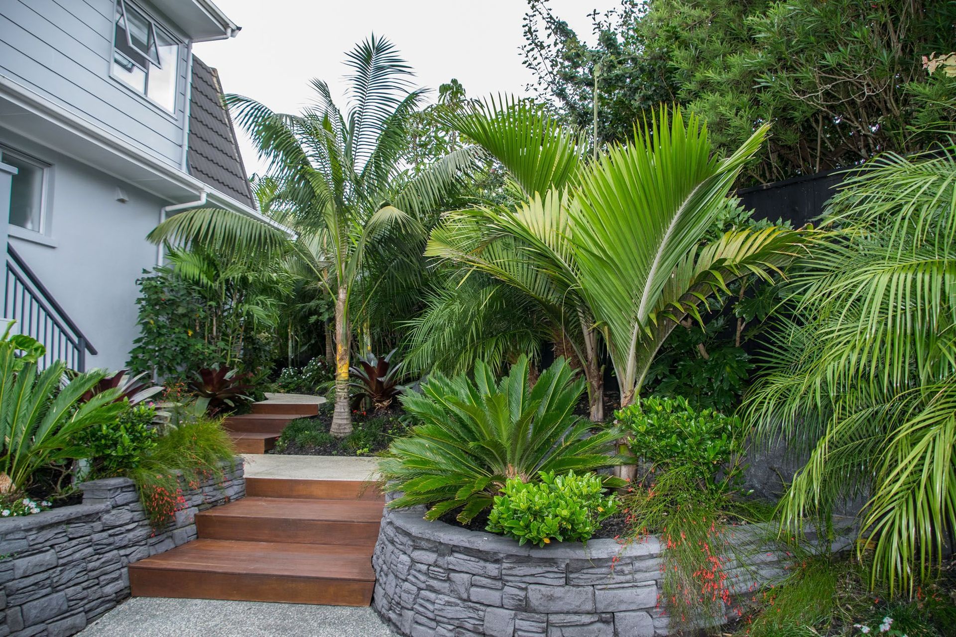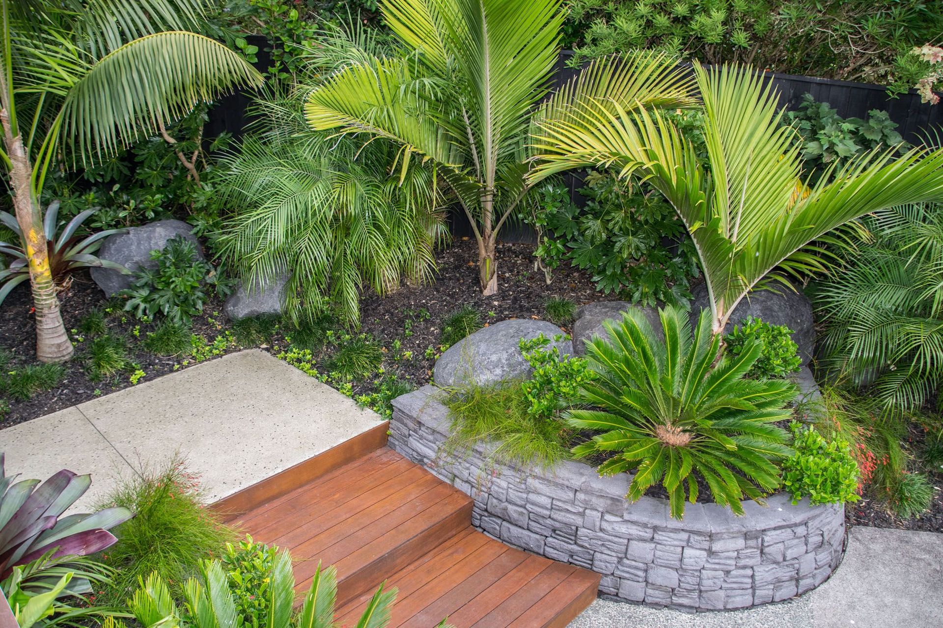 ArchiPro Project Summary - A stunning transformation of a Mairangi Bay backyard into a tropical paradise, featuring expertly placed boulders for retaining walls and elegant insitu concrete, creating a harmonious blend of luxury and practicality for family enjoyment.