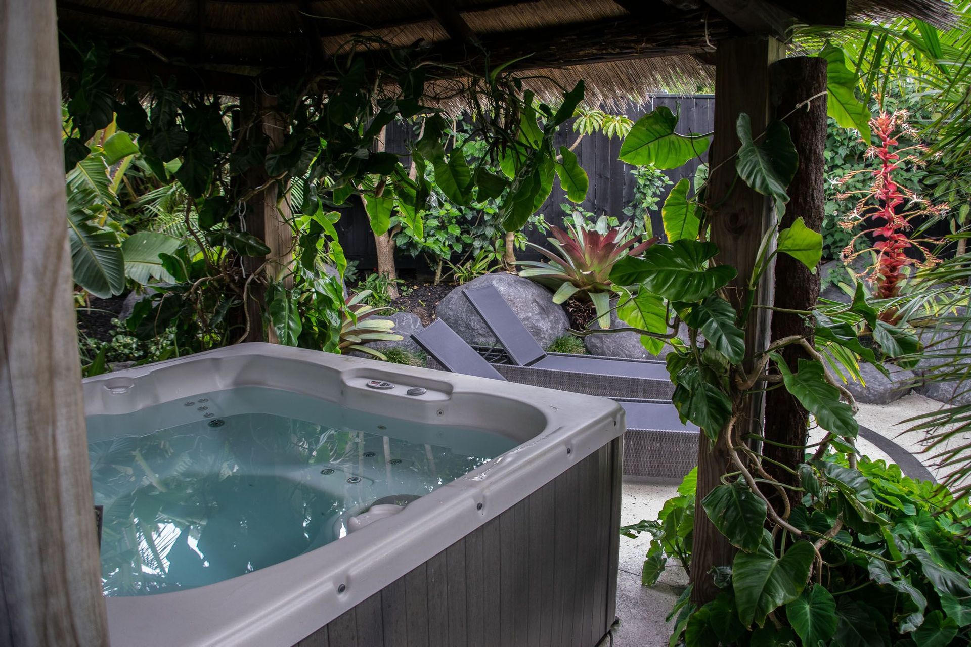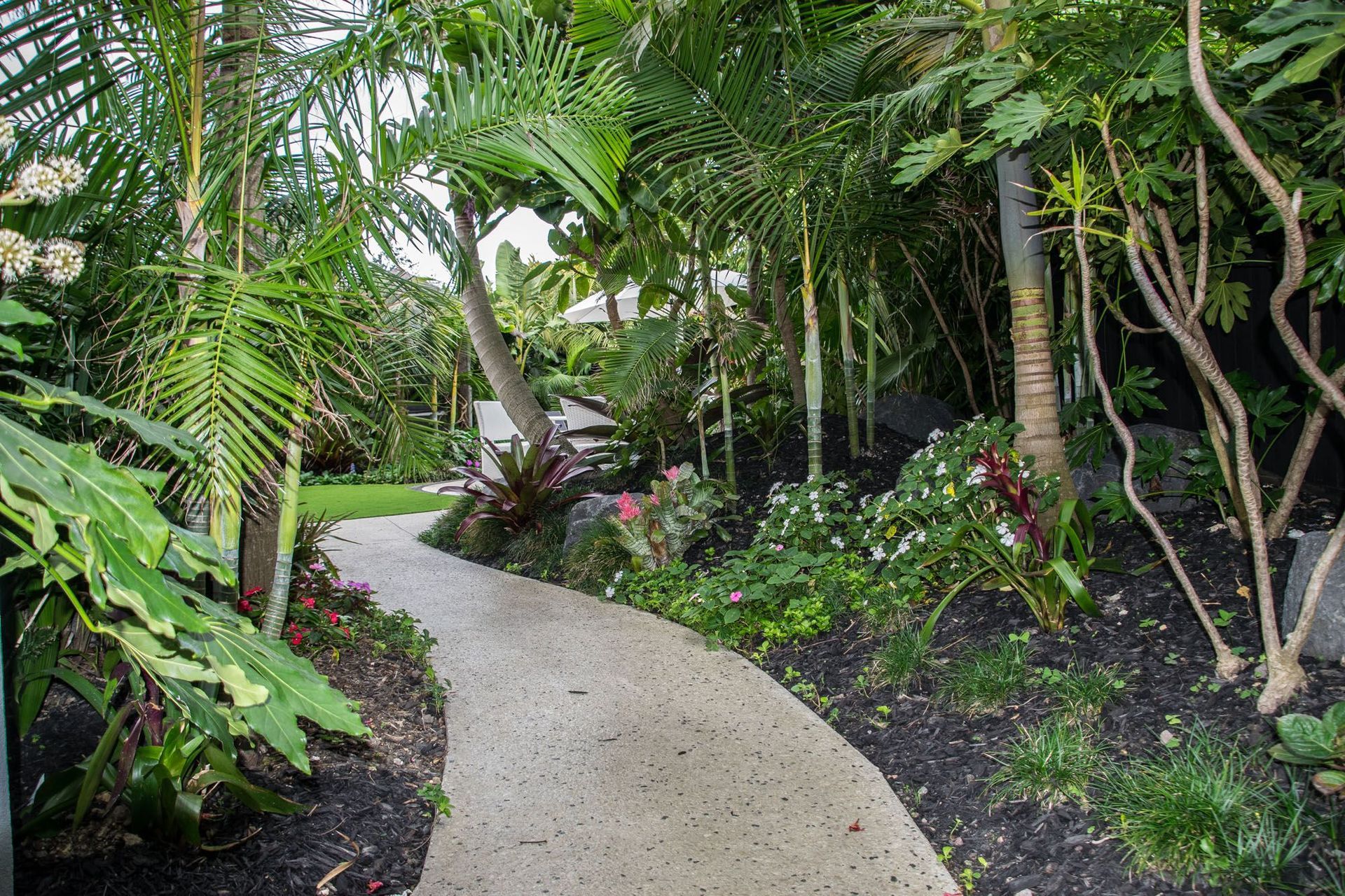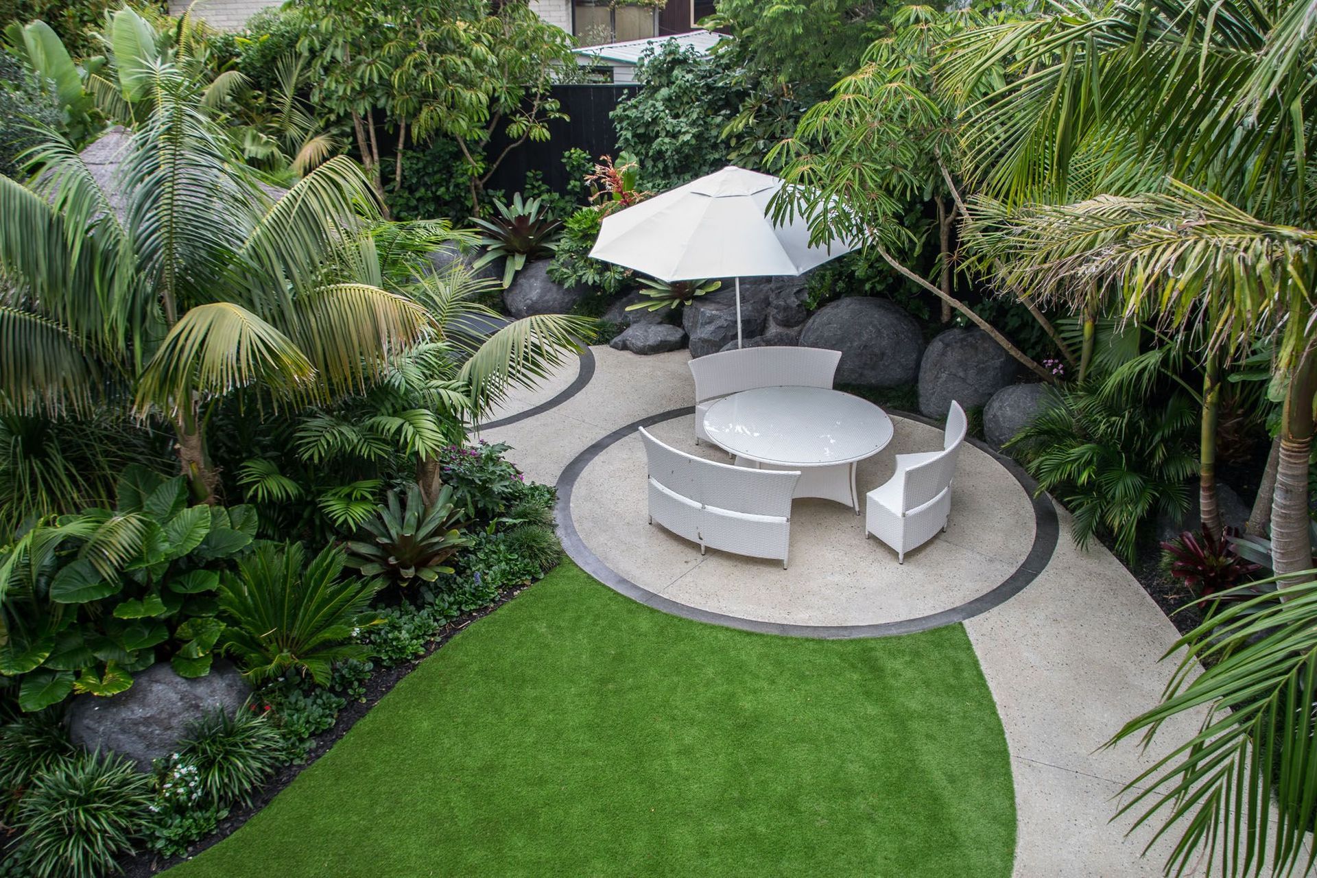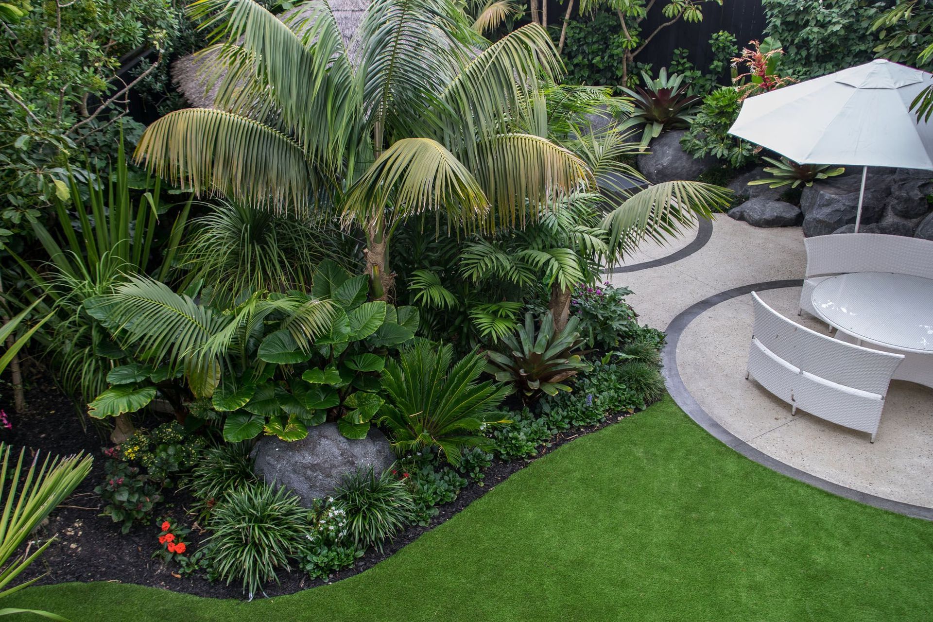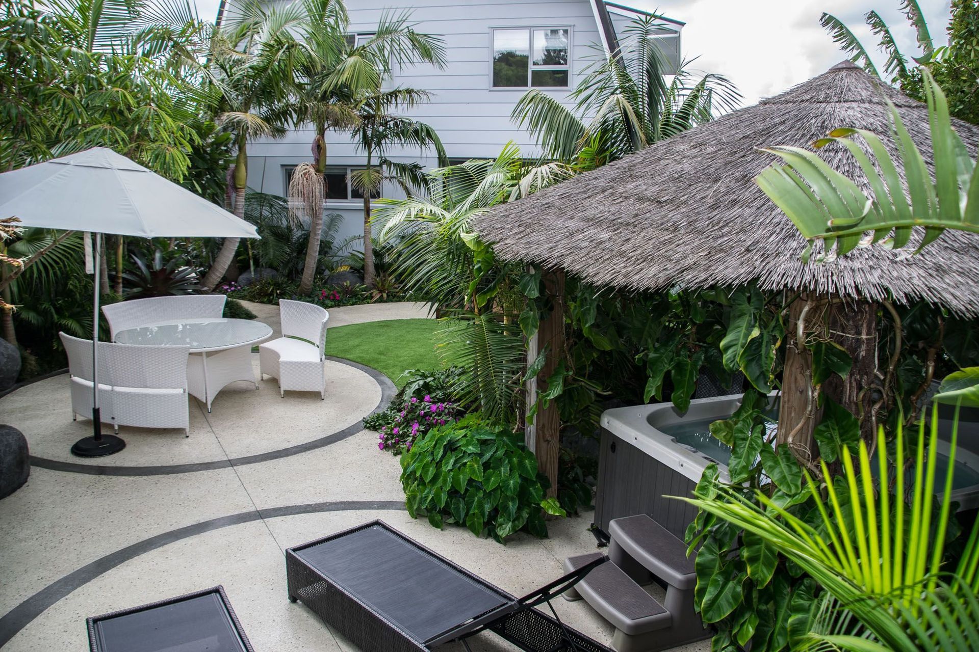 ArchiPro Project Summary - A stunning transformation of a Mairangi Bay backyard into a tropical paradise, featuring expertly placed boulders for retaining walls and elegant insitu concrete, creating a harmonious blend of luxury and practicality for family enjoyment.
