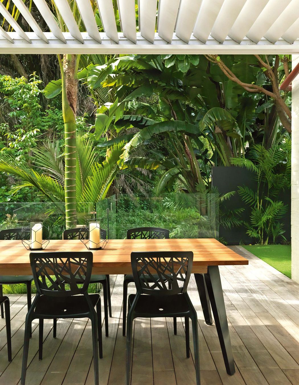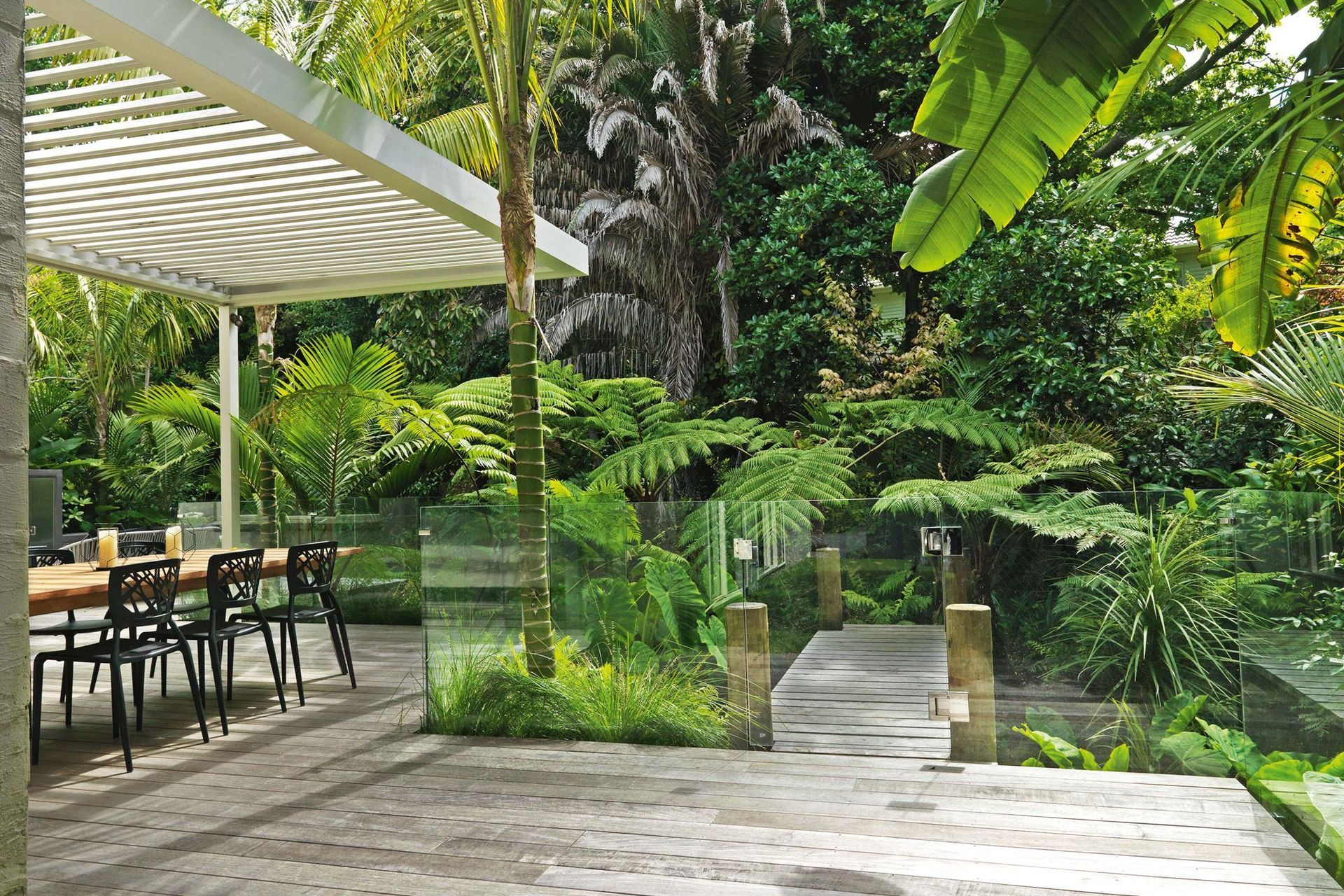 ArchiPro Project Summary - Transforming a challenging site into a tropical oasis for family living, featuring enhanced outdoor spaces, a louvre roof for sheltered entertainment, and a striking feature bridge, all while maximizing natural vistas and child-friendly play areas.
