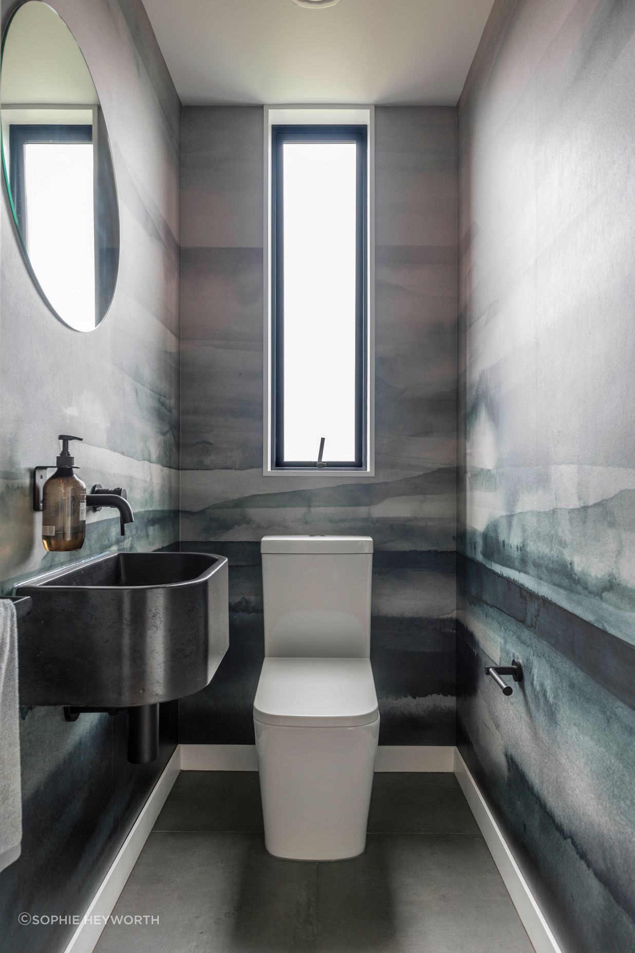 Enjoying a close relationship with design lead Laura McLeod and quantity surveyor Stephanie Collingwood made the process so much easier. “It also helped that Tom doesn’t have strong views about interiors,” laughs Anna. With her role at the hospital and three young children, time was of the essence when making decisions. She ripped photographs out of magazines, went to many show homes and did a little research on the internet. “Truth is, I have a no-regrets policy,” she says. When it came to the myriad decisions re flooring, tapware, tiling, vanities – the list goes on – she chose and then moved on. “Sometimes having limited time can be beneficial.” One aspect she did relish was selecting the wall coverings. “I would have put wallpaper in every room if I could afford it,” says Anna. Instead, an Emma Hayes paper is cloud-like in the main bedroom behind the bed, a gentle juxtaposition against robust black floor-to-ceiling joinery. And guests in the powder room get to experience Hayes’ fluid graphics with dreamy wallpaper in tones of green and black. Colour kisses the bedrooms too with navy in the main suite, forest green in the flexi room which doubles as an office and media room, and a pinky peach tone in the spare bedroom. “Mum lives with us two days of the week to look after children so she gets to experience that room the most,” says Anna.