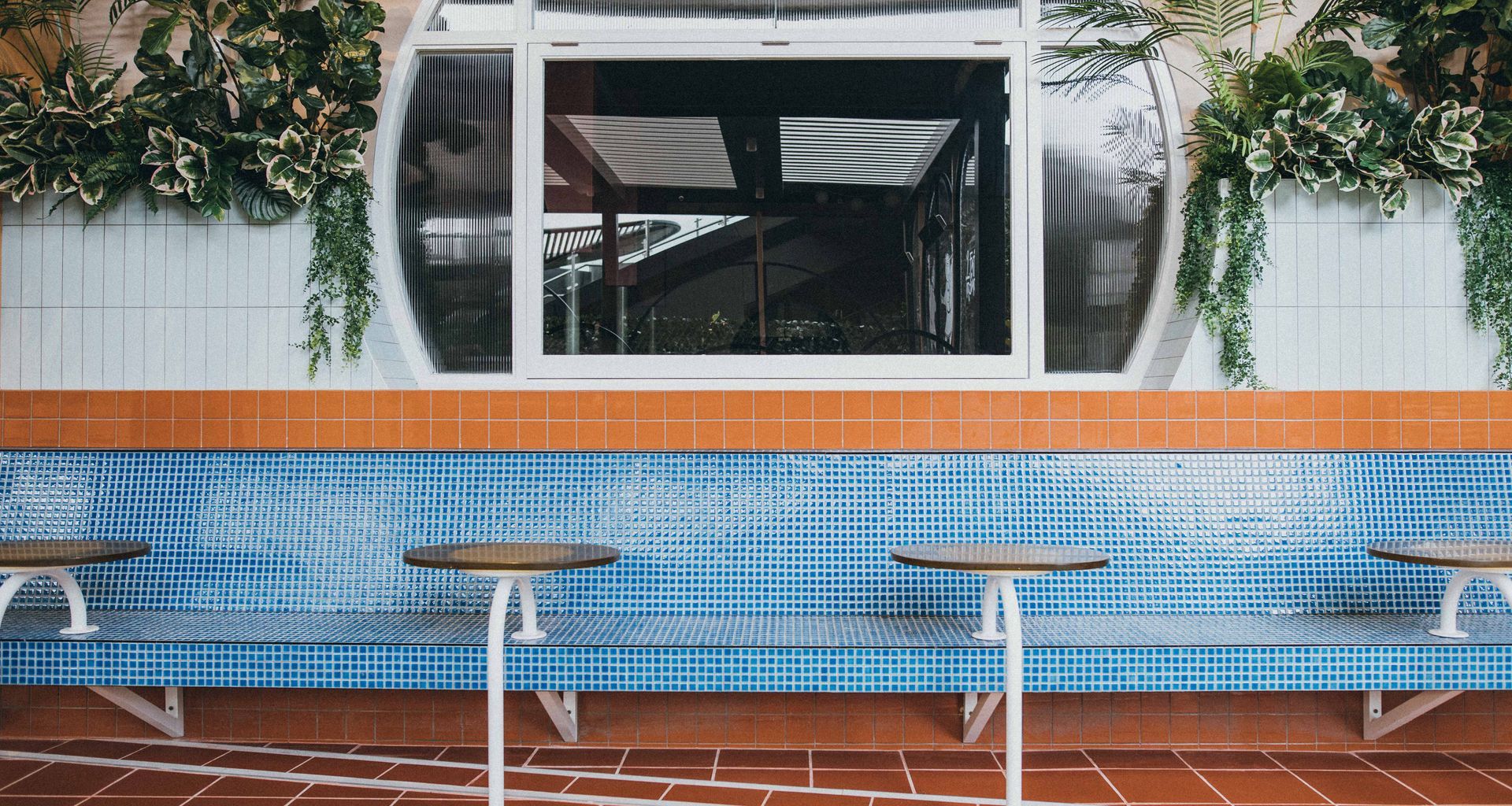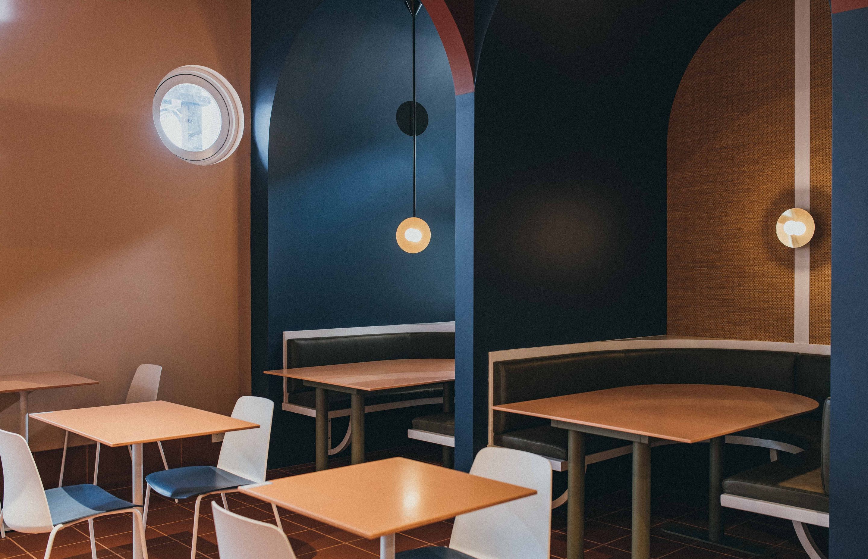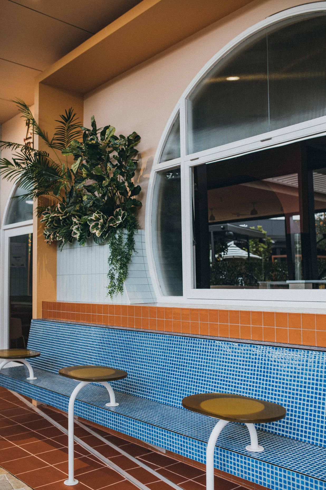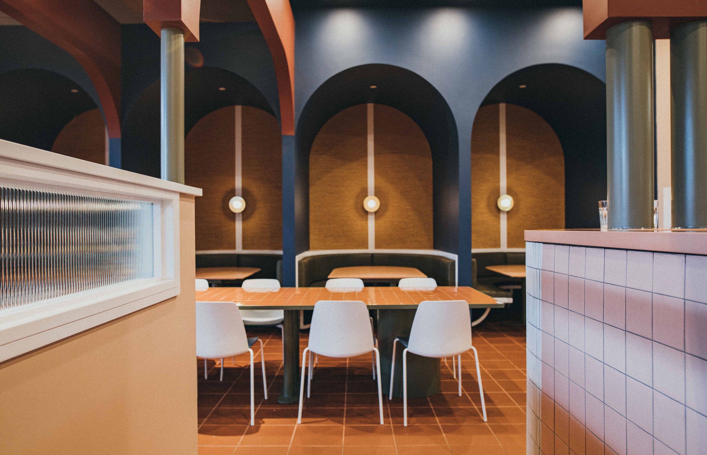ArchiPro Project Summary - Two Fat Indians revitalizes its brand in the southern suburbs with vibrant colors, brass accents, and a blend of traditional Indian shapes and contemporary design, featuring sweeping arches and custom details throughout the space.