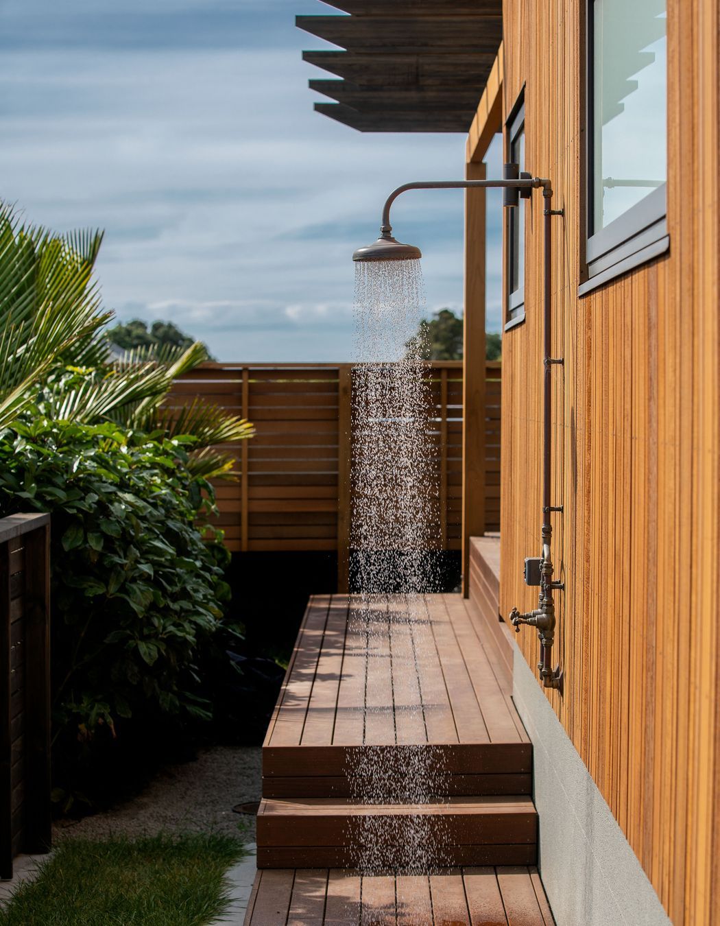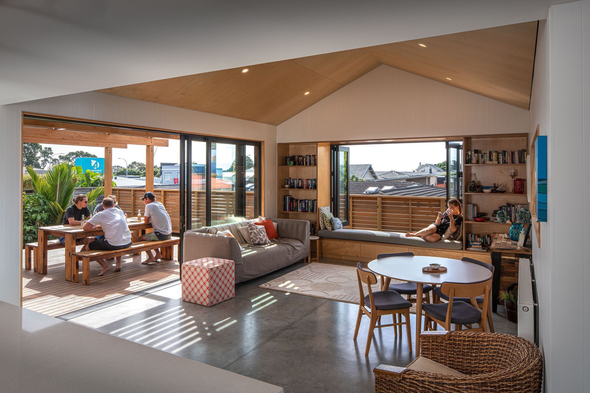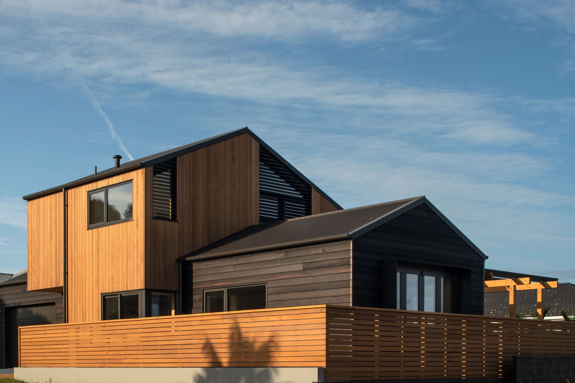 ArchiPro Project Summary - A contemporary beachside retreat in Strandon, designed to celebrate Kiwi culture and family gatherings, featuring a harmonious blend of dark and bright cedar cladding, multifunctional spaces, and seamless indoor-outdoor living.