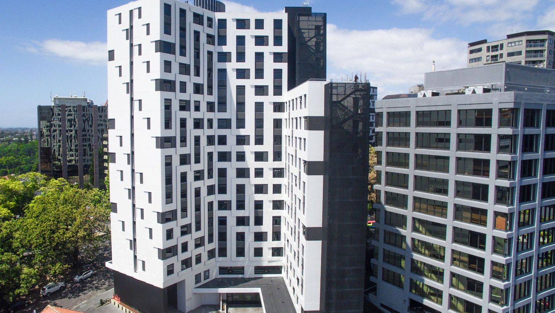 ArchiPro Project Summary - Award-winning student accommodation at 55 Symonds Street, designed by Ashton Mitchell, featuring a bold structural exoskeleton and innovative social spaces, complemented by high-quality Fusion Grey tiles.