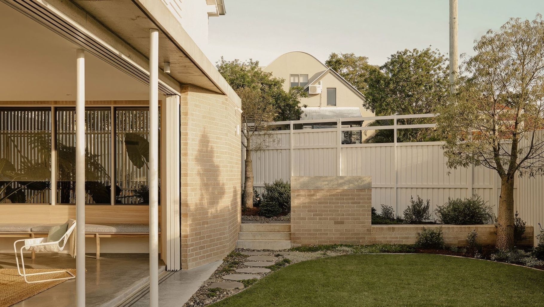 ArchiPro Project Summary - A harmonious inner-city block blending architecture and landscape for seamless indoor-outdoor living, featuring muted plant selections and sculptural Queensland Bottle trees.