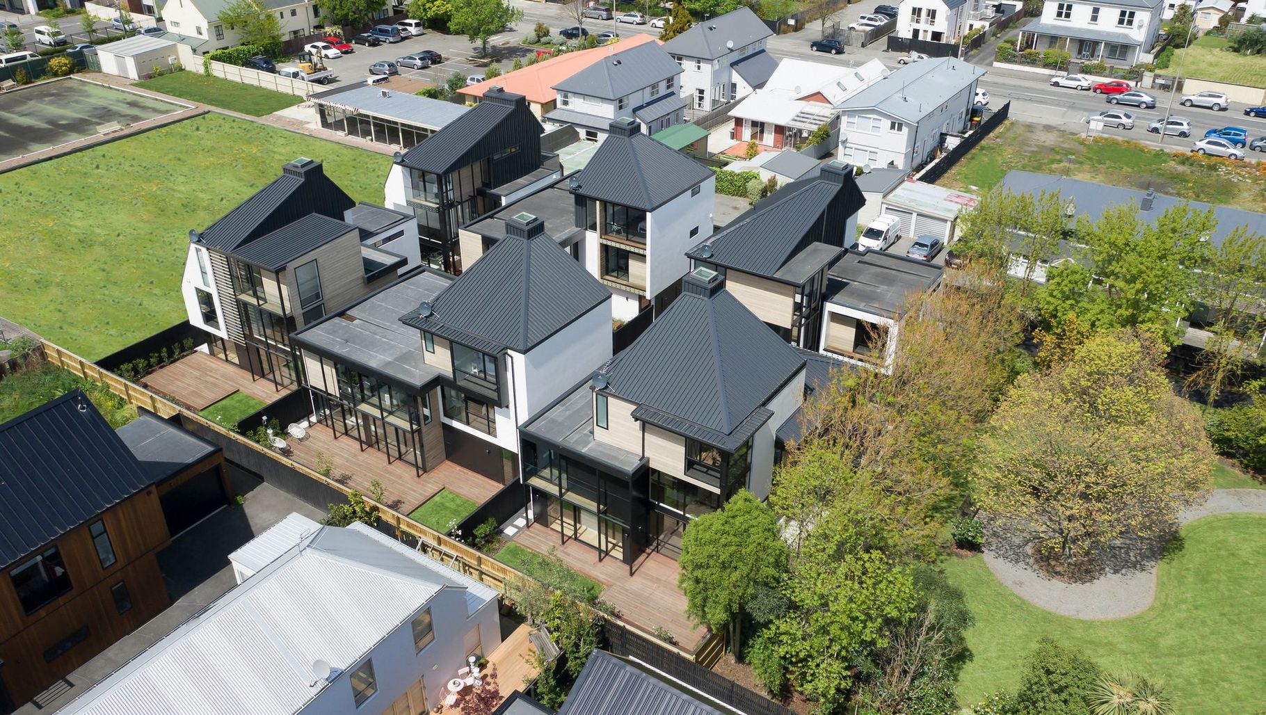 ArchiPro Project Summary - Urban Village Townhouses: A medium-density living solution near Christchurch, featuring six triple-floored units designed for optimal sunlight, private outdoor spaces, and a strong community atmosphere, all while prioritizing sustainability and modern living.