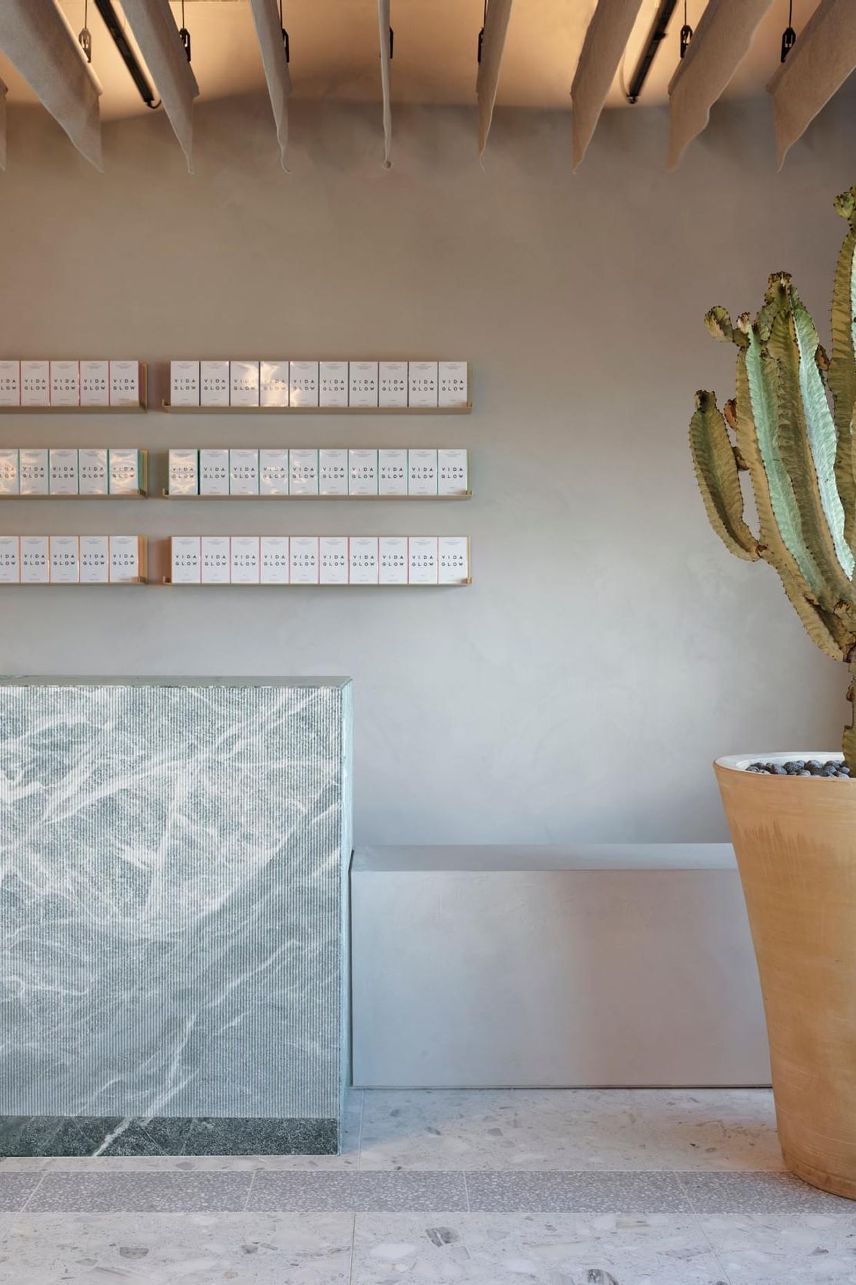 ArchiPro Project Summary - Vida Glow HQ features a wellness-focused fit-out with a full working kitchen and gym, promoting a healthy work-life balance. The entry lounge includes a Collagen Bar, enhancing visitor experience with the brand's signature ingestible products.