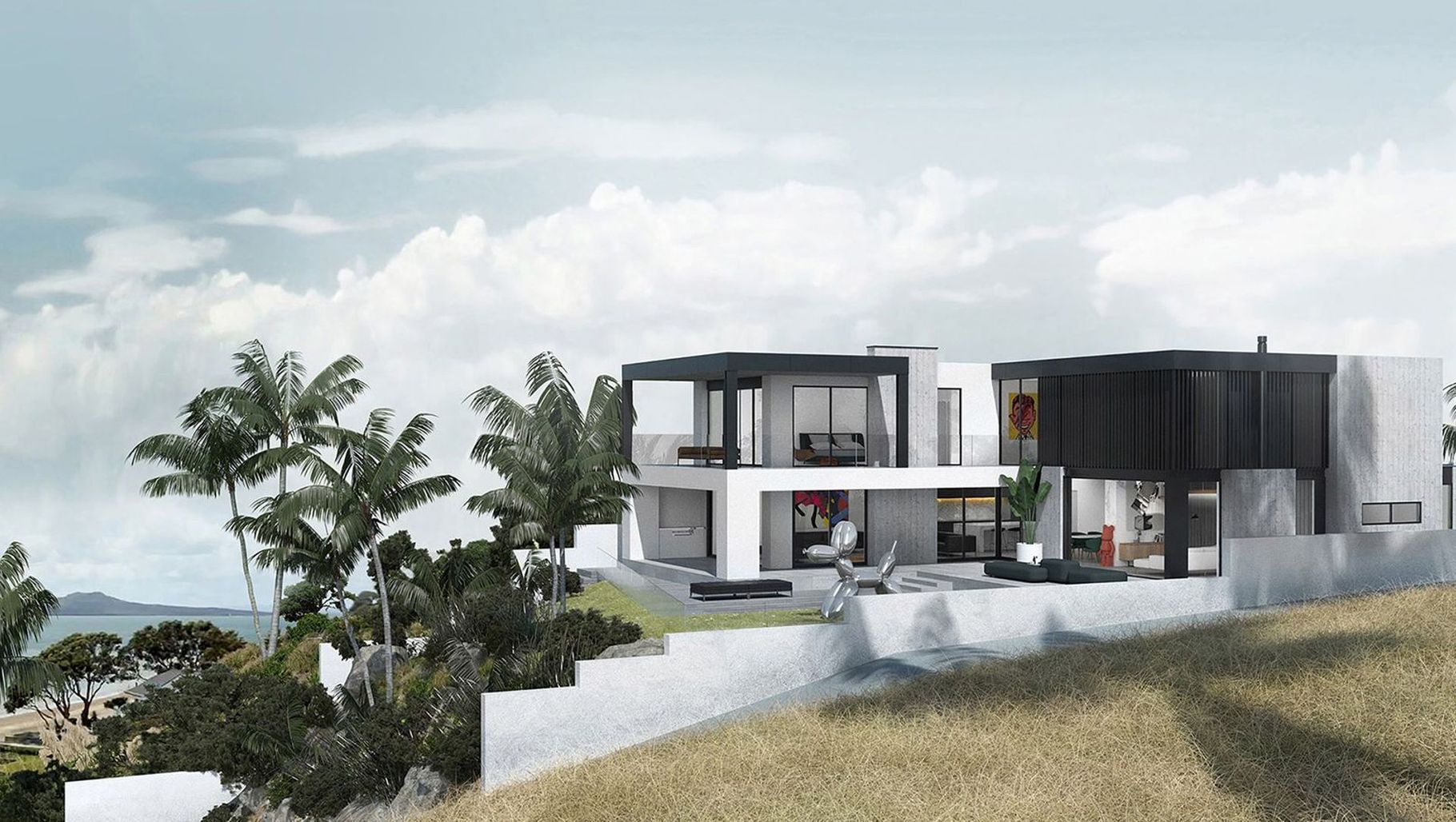 ArchiPro Project Summary - Modern cliffside residence featuring a stunning view of Campbell’s Bay Beach, with a beautifully elevated pool and deck, nestled among Puriri trees, offering breathtaking vistas of Rangitoto and the Hauraki Gulf.