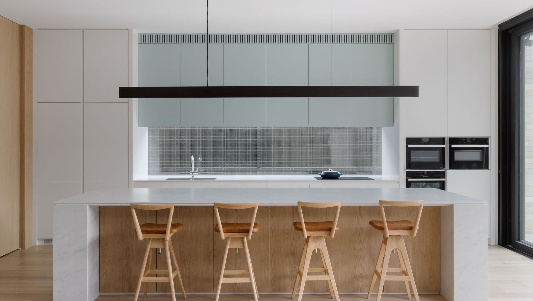Responding to the northerly rear orientation, the new generous kitchen, dining and living spaces connect seamlessly to the backyard via large sliding stacker doors. A palette of pale oak timbers, warm greys and lightly textured stone, add texture and warmth to the spaces, with subtle blue accent joinery and wall finishes for a touch of colour.