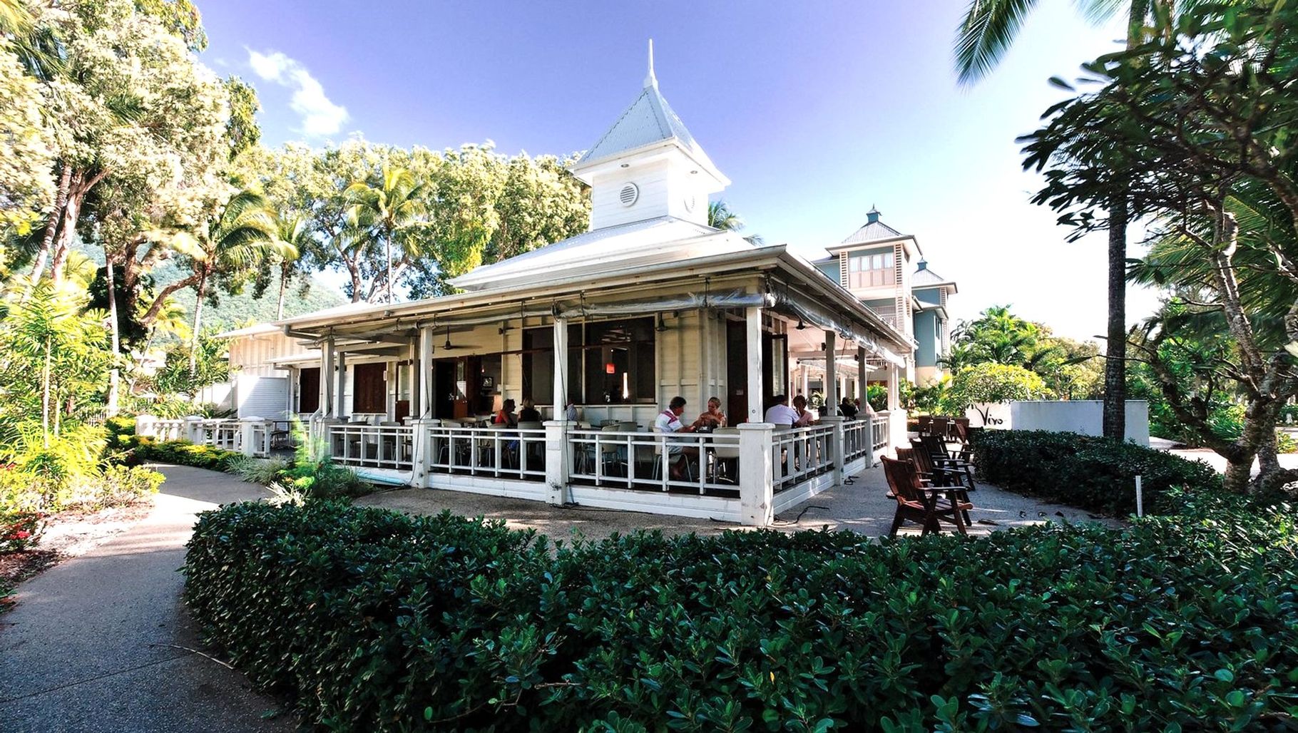 ArchiPro Project Summary - Vivo Restaurant features a Queensland colonial exterior with elegant white walls and turrets, complemented by a vibrant interior and a chic sunken bar, serving as a lively hub for guests at the Amphora Resort in Palm Cove.