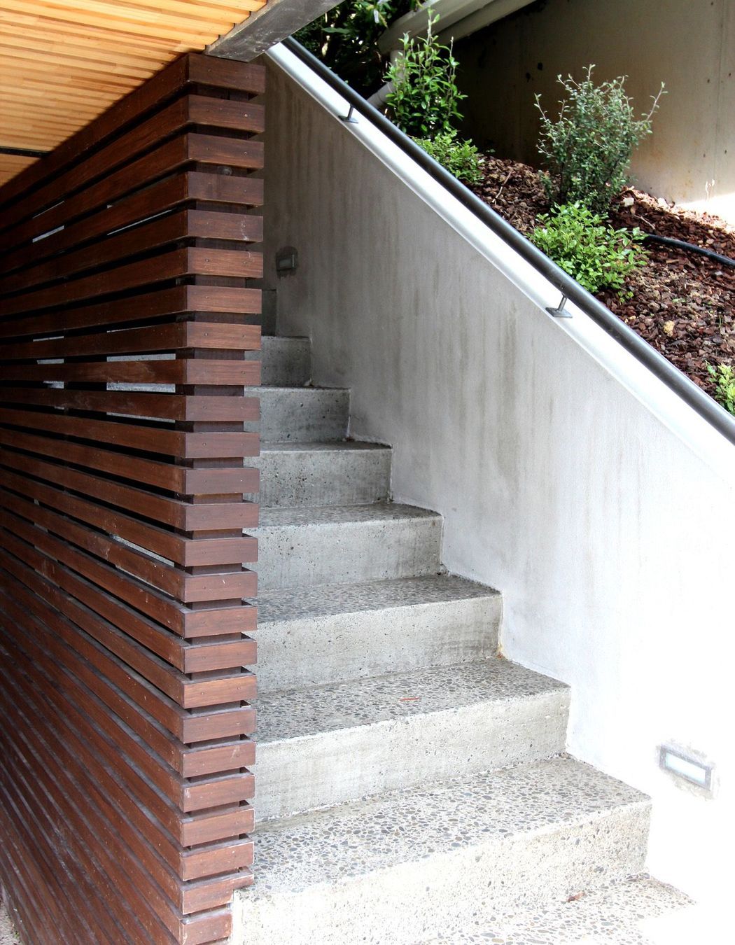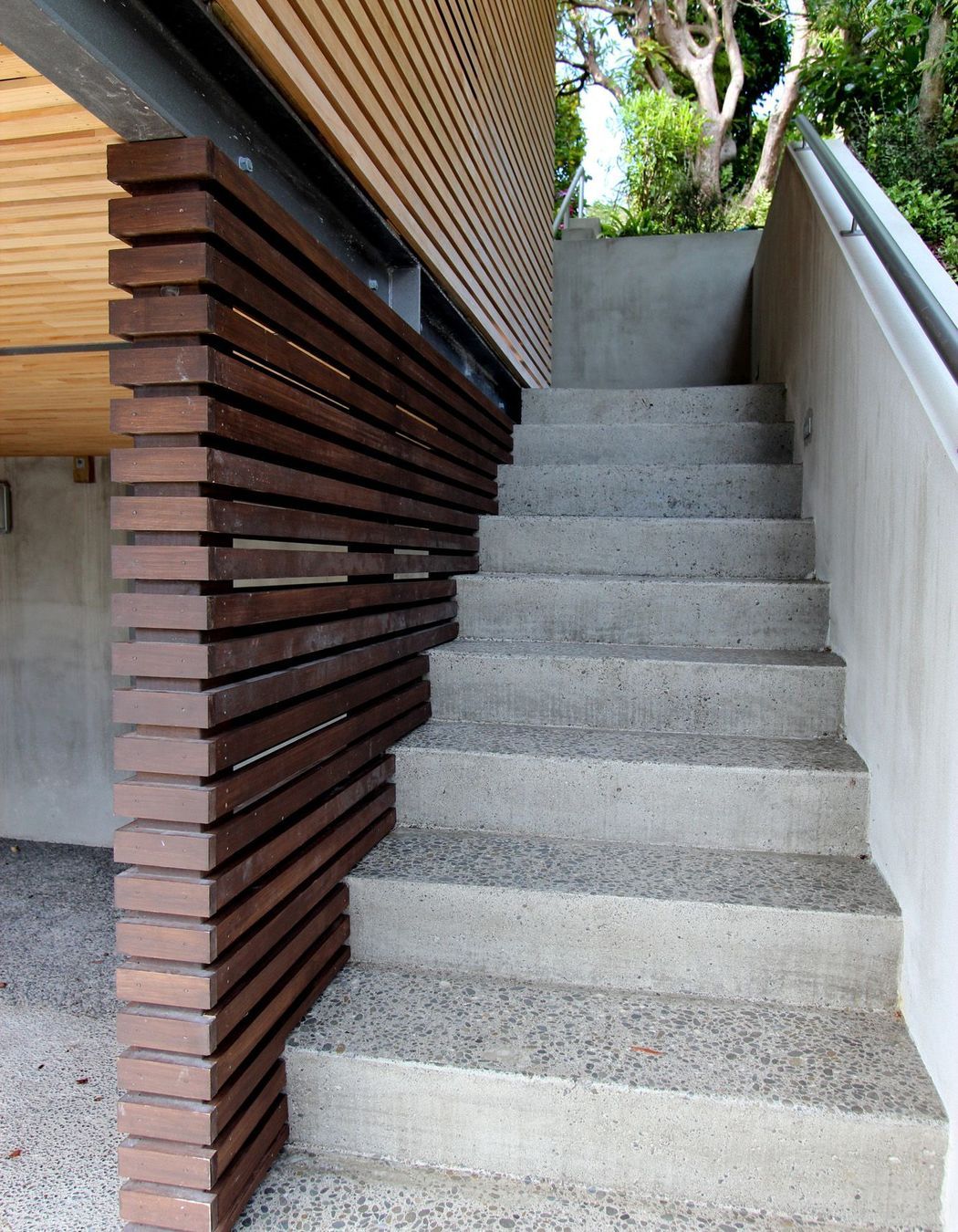 ArchiPro Project Summary - Contemporary carport design optimizing a narrow, contoured site for off-street parking, upper-level storage, and an elegant property entrance.