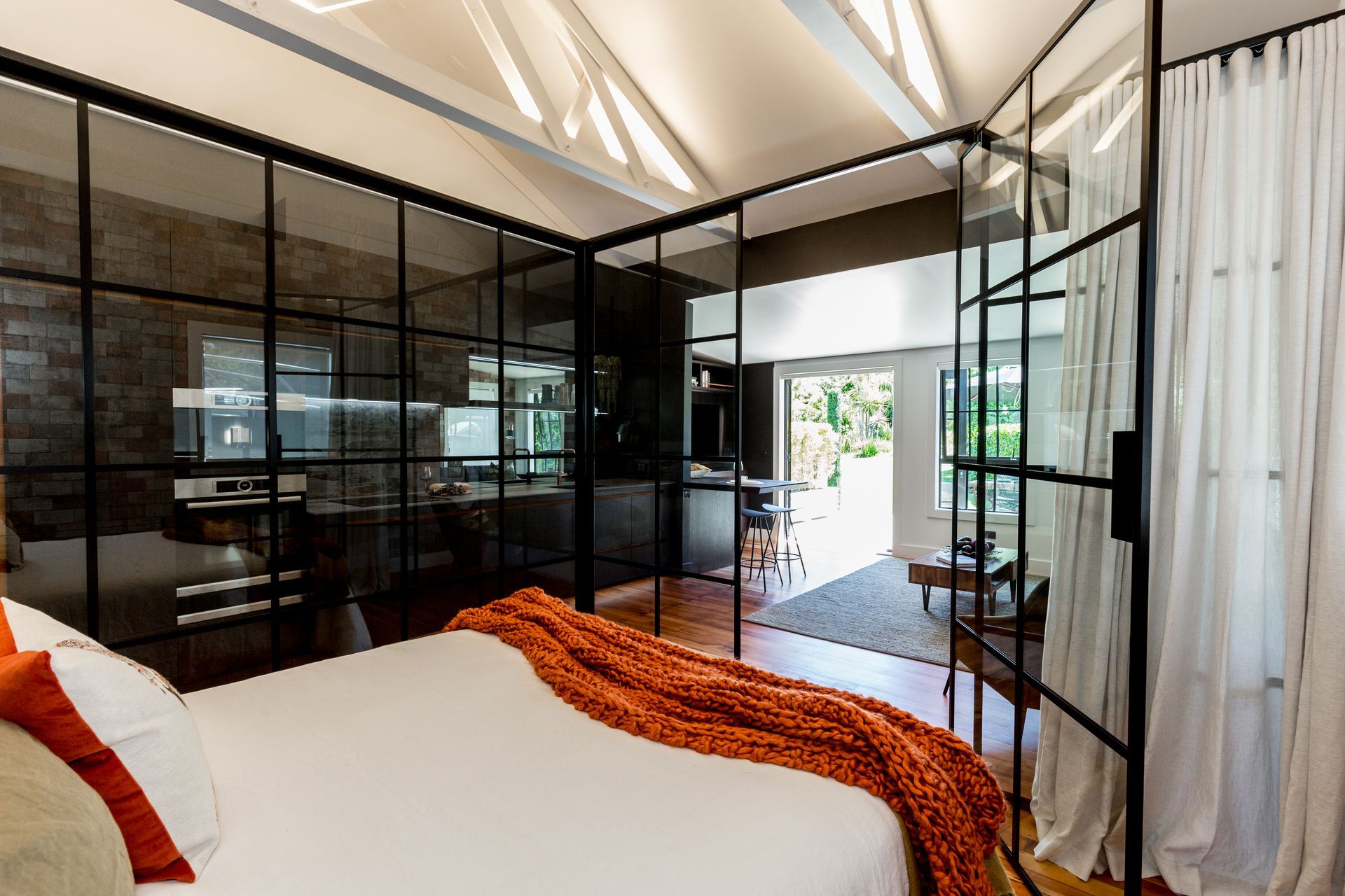 ArchiPro Project Summary - A 50m2 studio on Waiheke Island, designed by Peta Davy at Yellowfox, featuring an industrial-style kitchen by Leonie Metge of Cube Dentro, complete with a cantilevered breakfast bar and Smokey Mirror splashback, evoking the charm of a New York cigar loft.