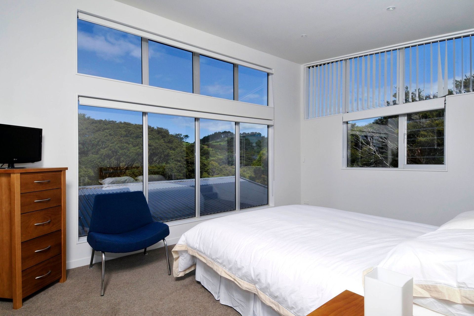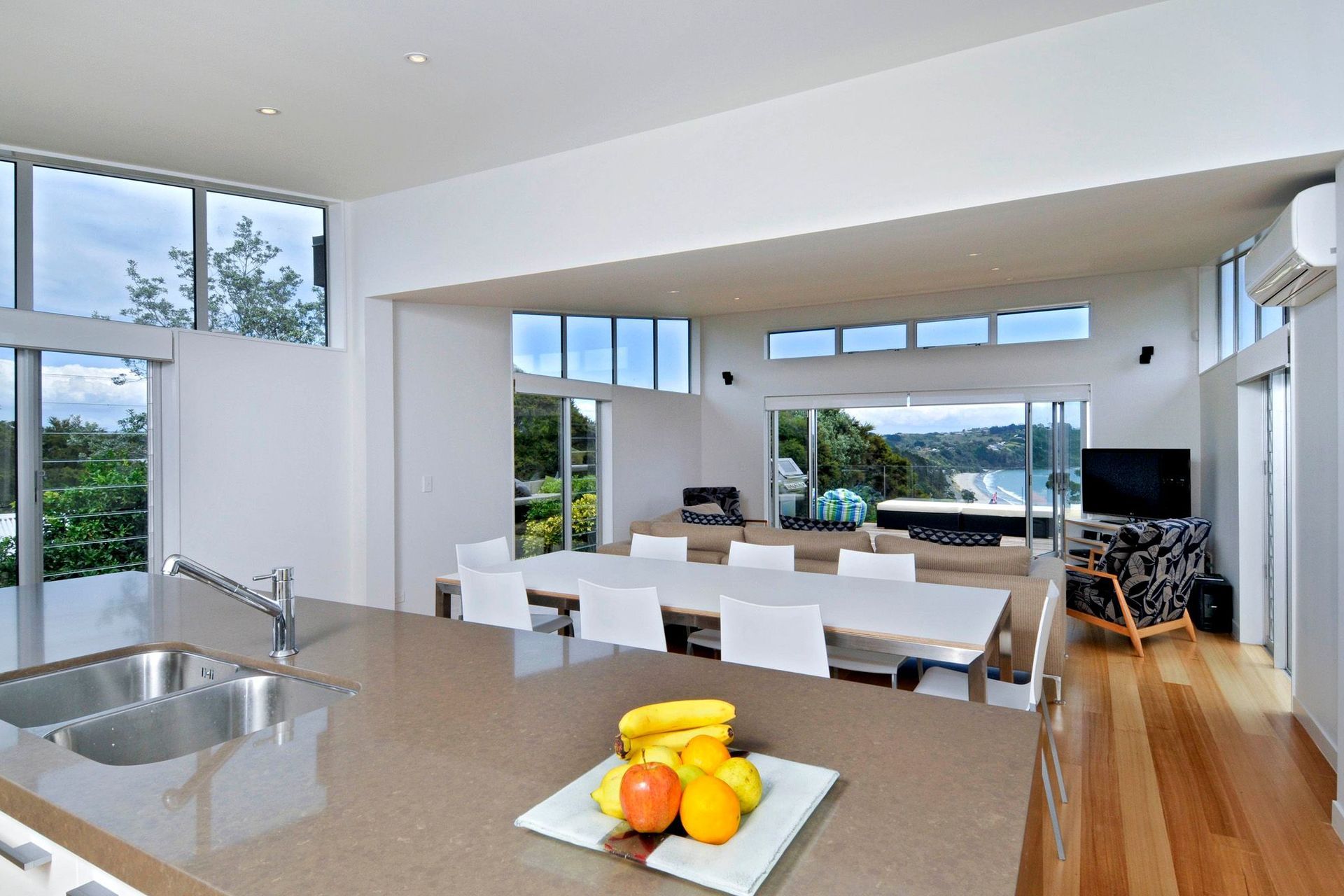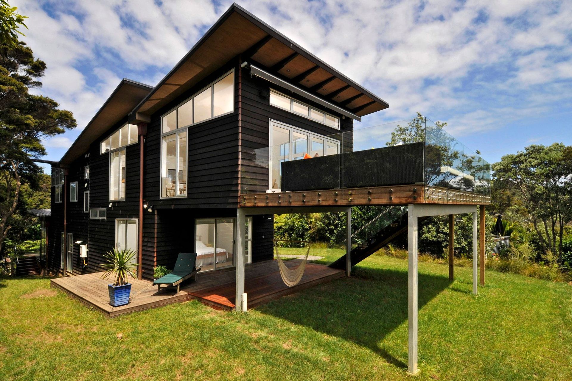 ArchiPro Project Summary - Contemporary 3-bedroom home designed over two levels, featuring stunning views of Onetangi Beach and surrounding bush, with a budget of $600,000 and a winged roof form that enhances natural light and vistas.