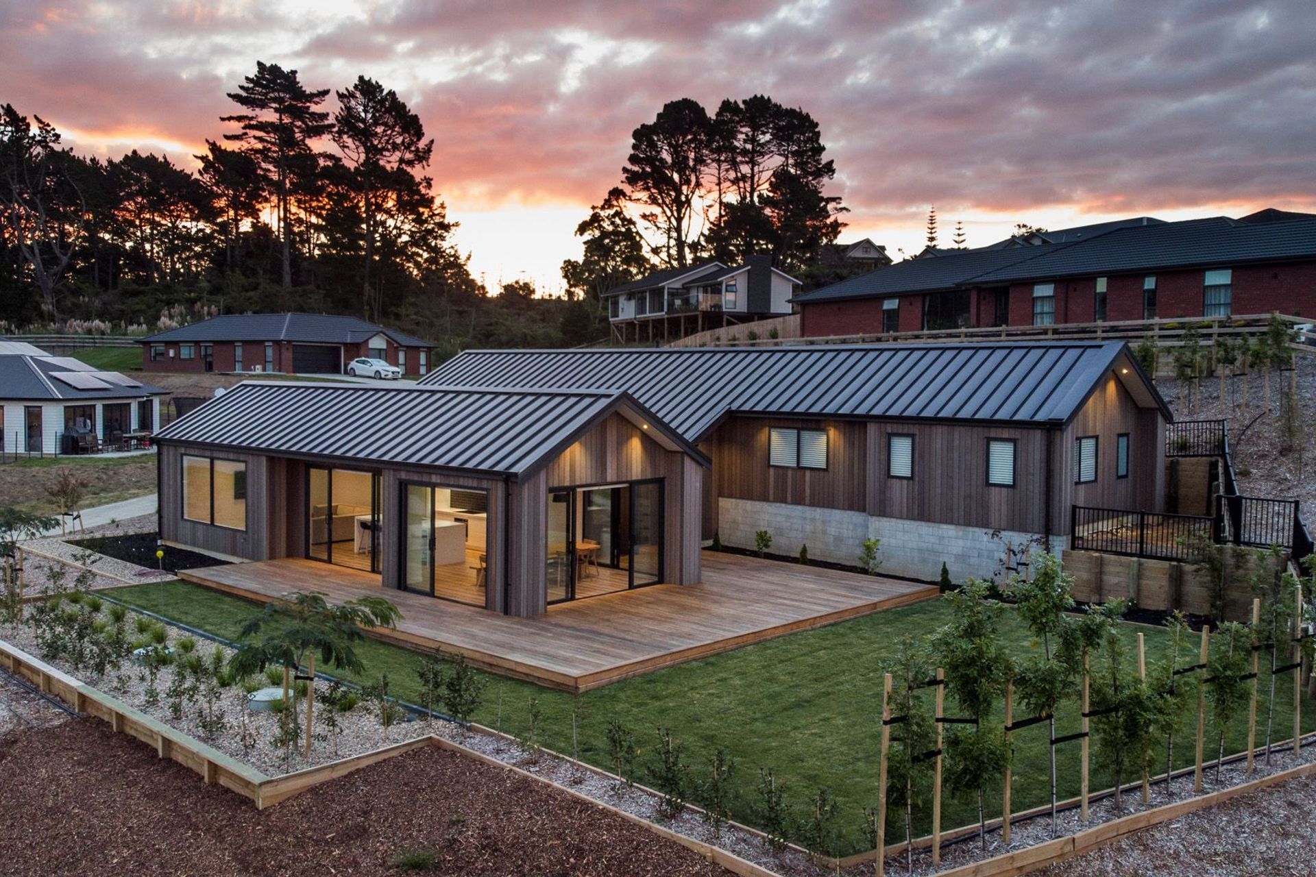 ArchiPro Project Summary - Contemporary pavilion-style home in Waimauku featuring cedar cladding, Euro-style roofing, and expansive decking for seamless indoor/outdoor living.