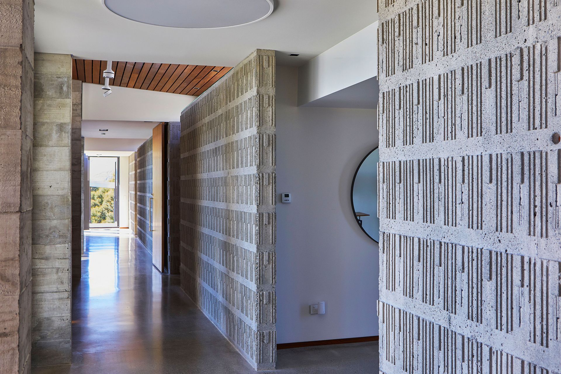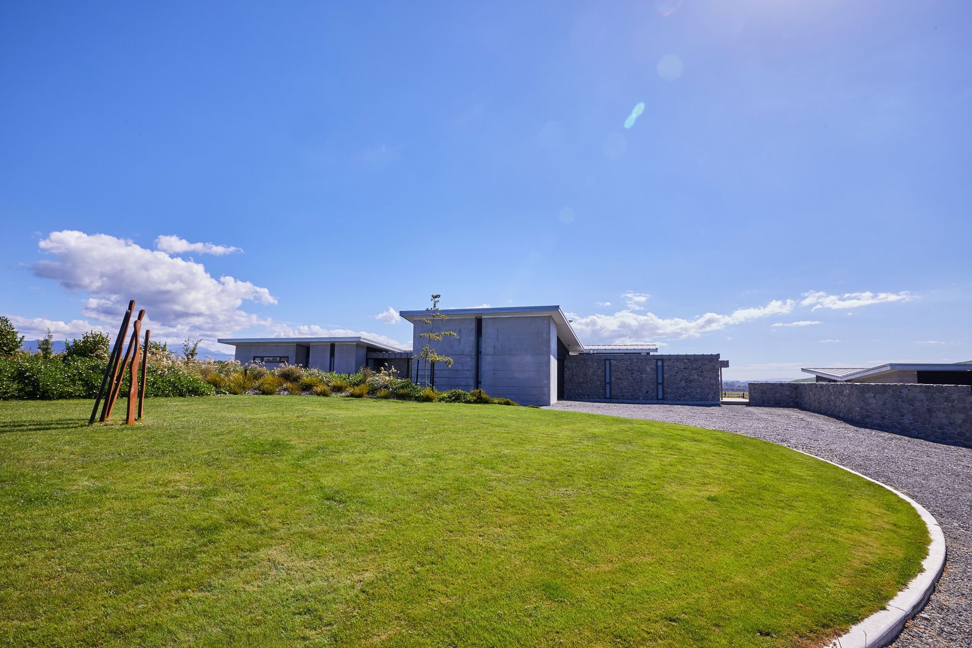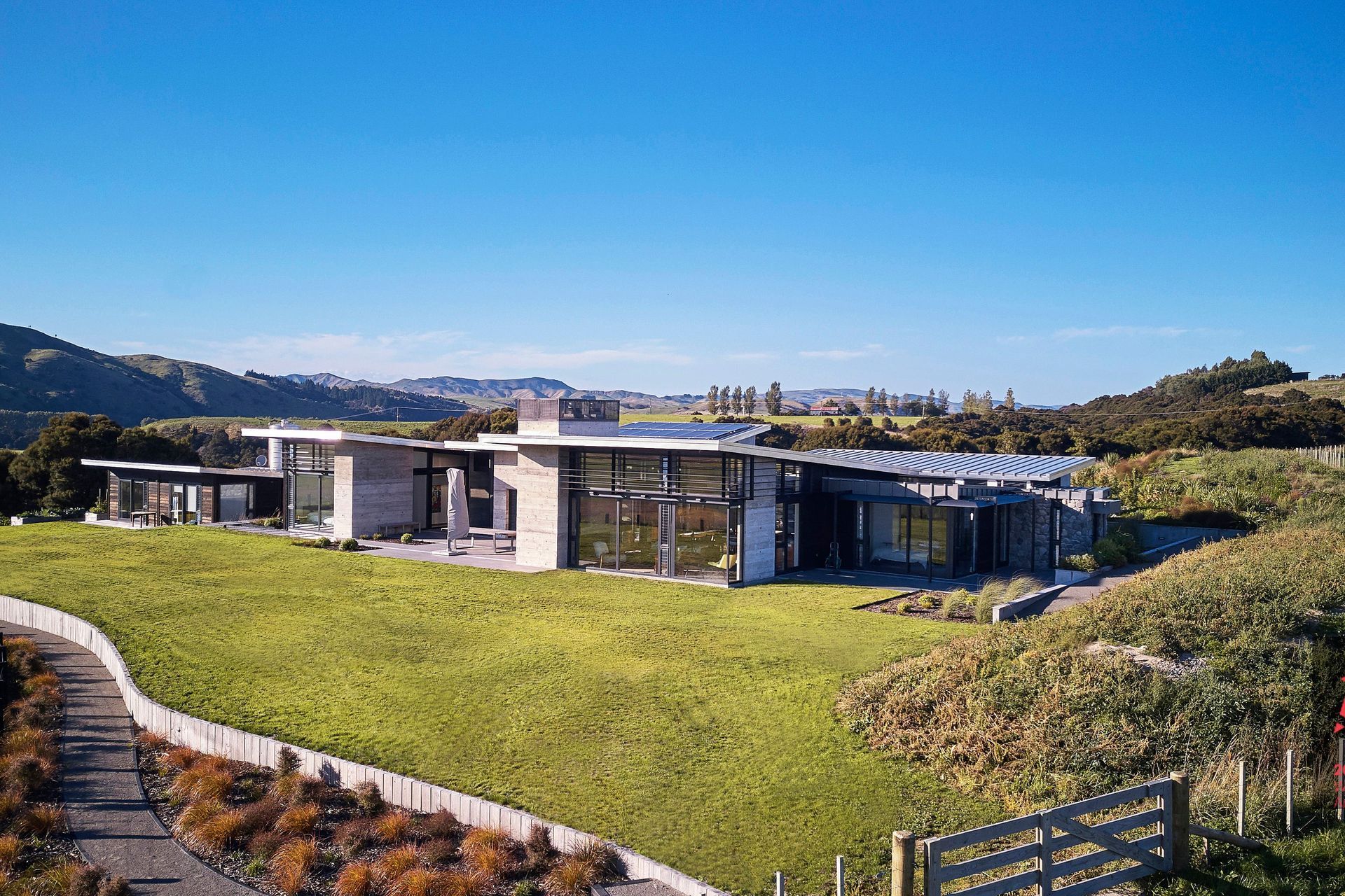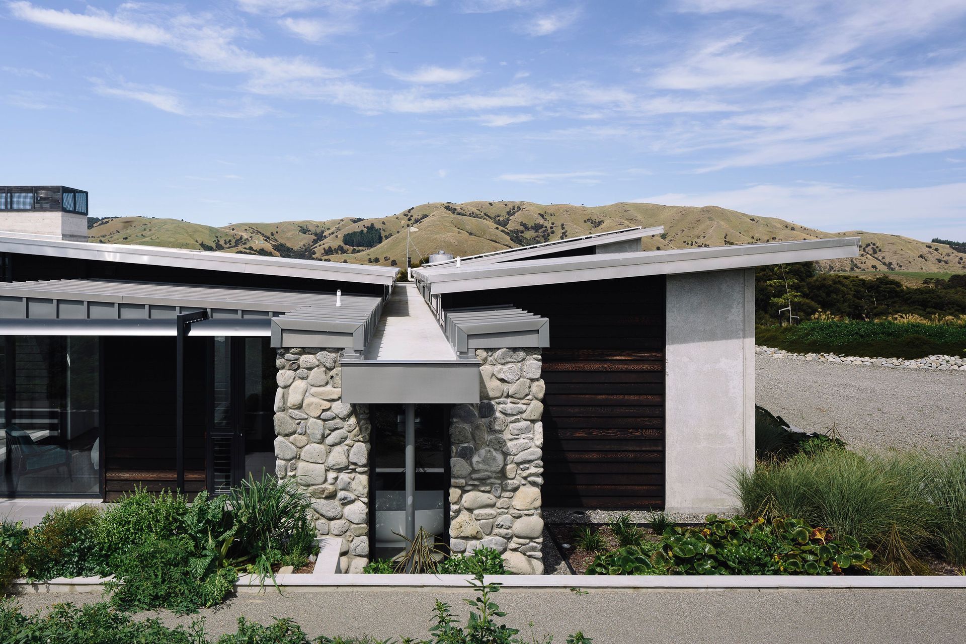 ArchiPro Project Summary - A striking residence on the Ruamahanga River, featuring robust materials and elevated views, designed with a strong East to West axis and a seamless connection to the surrounding rural landscape.