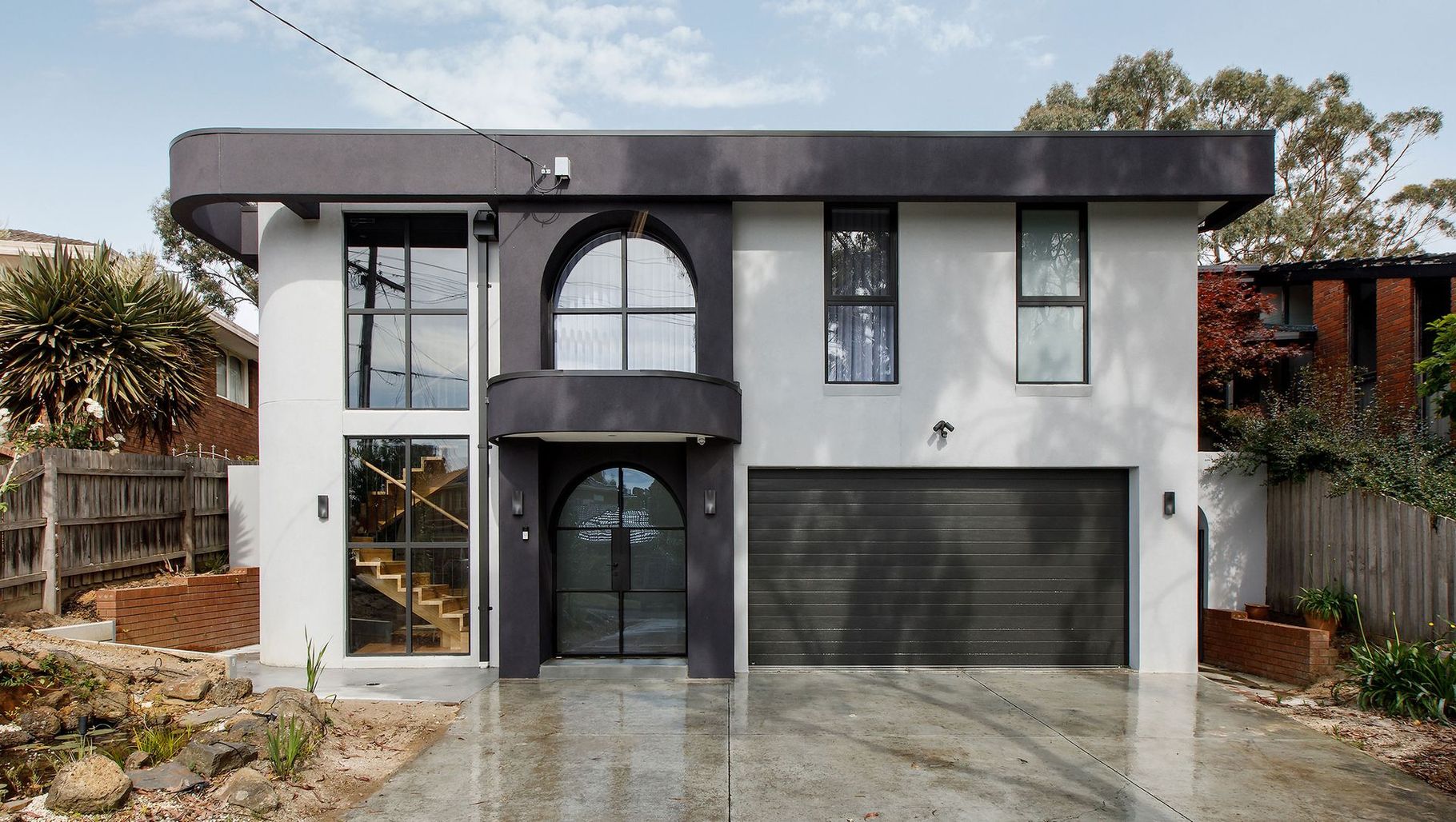 ArchiPro Project Summary - A stunning transformation of a 70s-era home, blending original architectural features with modern updates, including new steel arched windows and entry doors, completed in 2024 for Archidea Group.