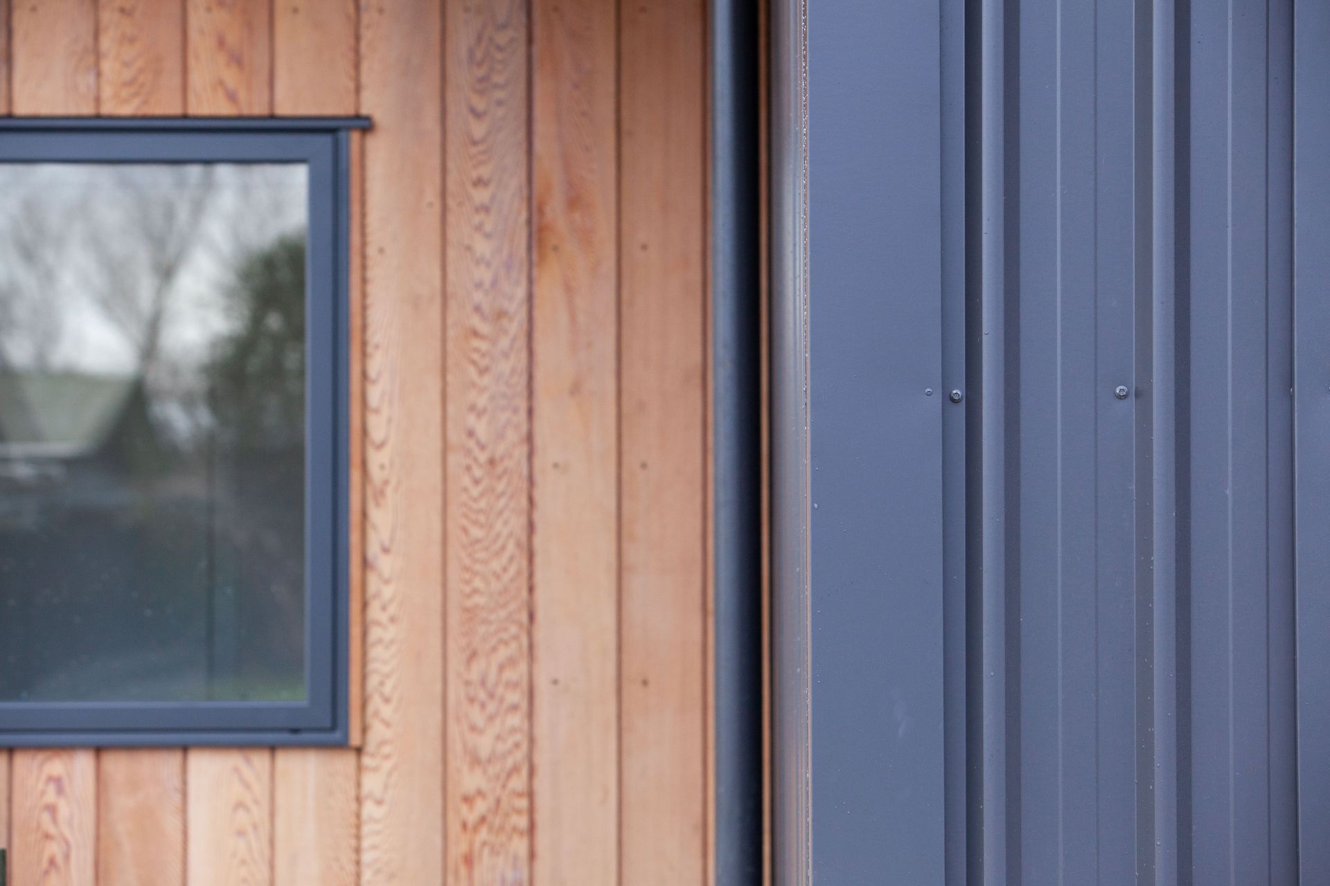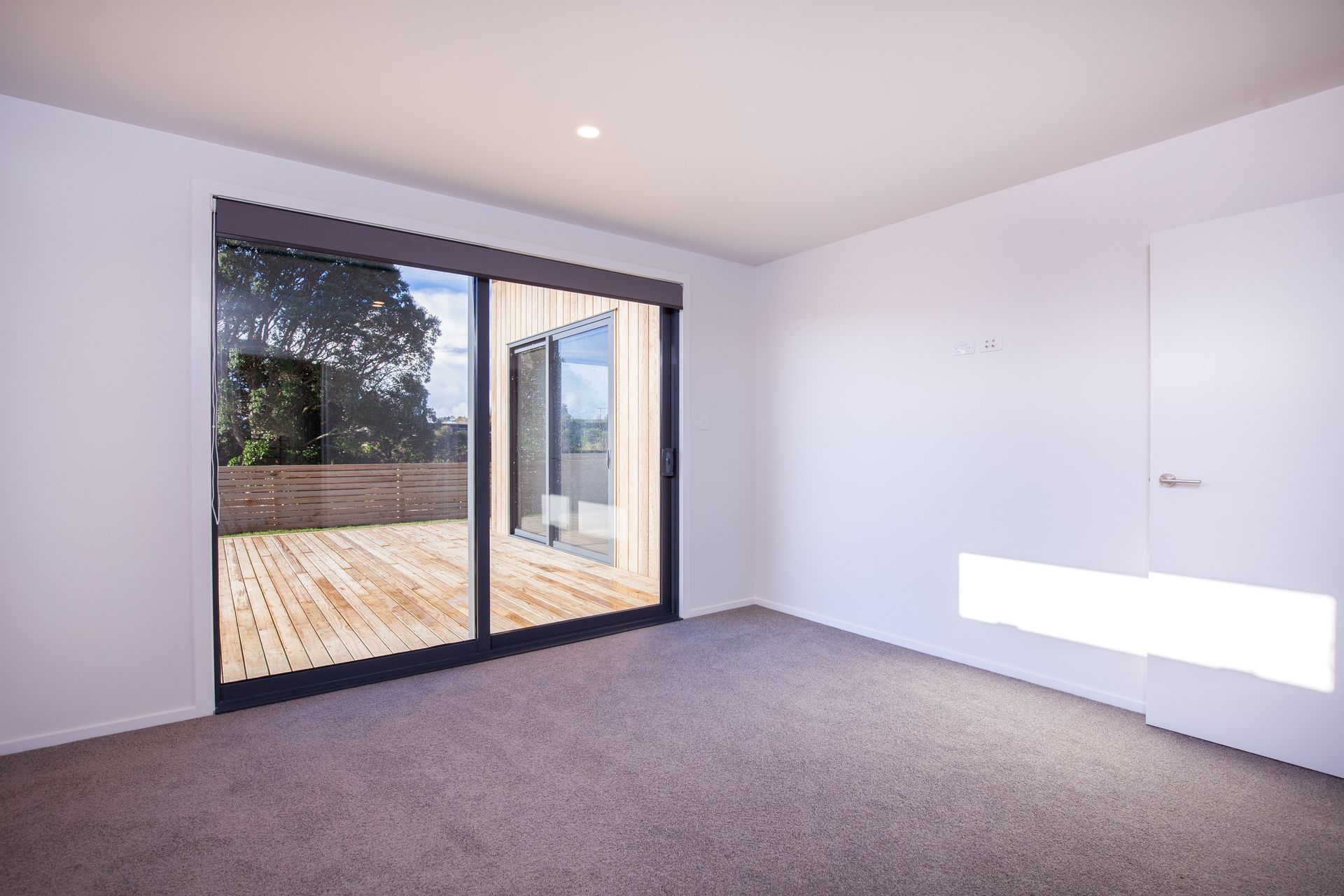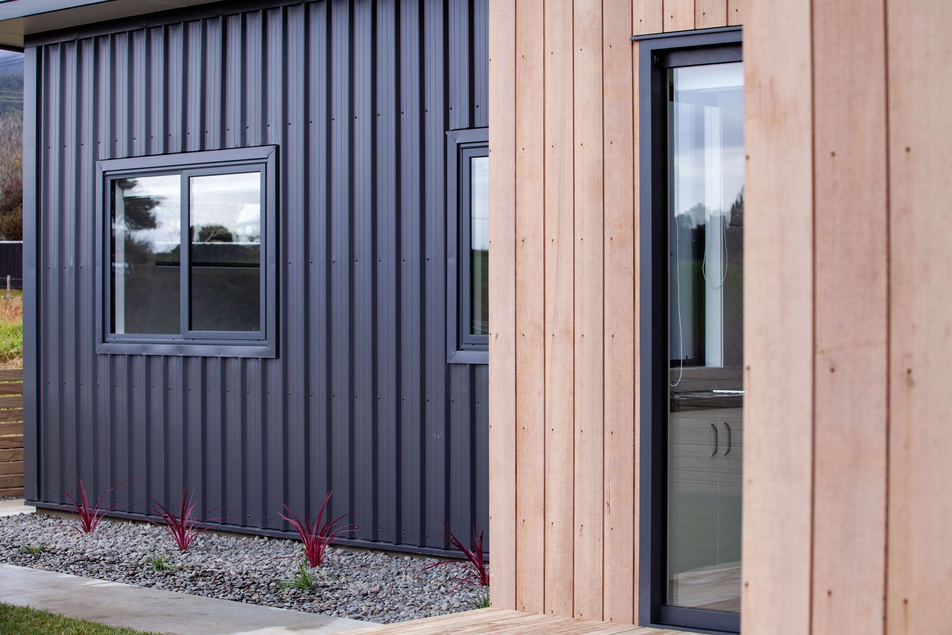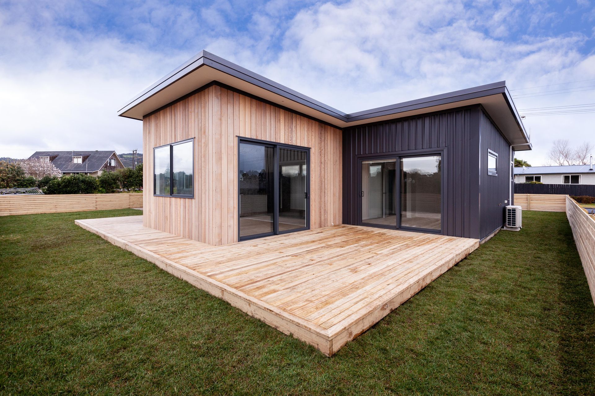 ArchiPro Project Summary - A stylish new build featuring an open plan kitchen with herringbone tile splash back, granite bench tops, and seamless indoor-outdoor flow to a timber deck, complemented by cedar and Colour Steel cladding.