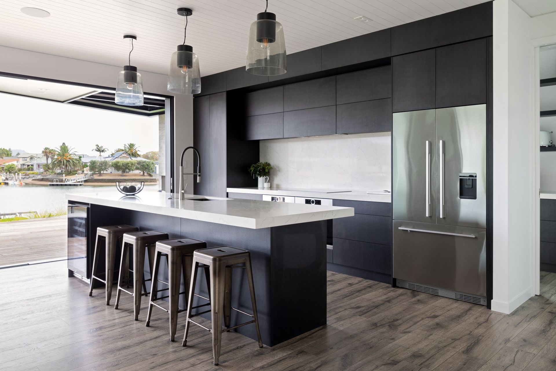ArchiPro Project Summary - Elegant Pauanui Waterways Beach House featuring Woodgrain Precast Concrete Panels, Dark Vertical Cedar, and Colorsteel Tray Roofing, complemented by expansive stacking aluminum sliders that create a seamless connection to the picturesque waterways.