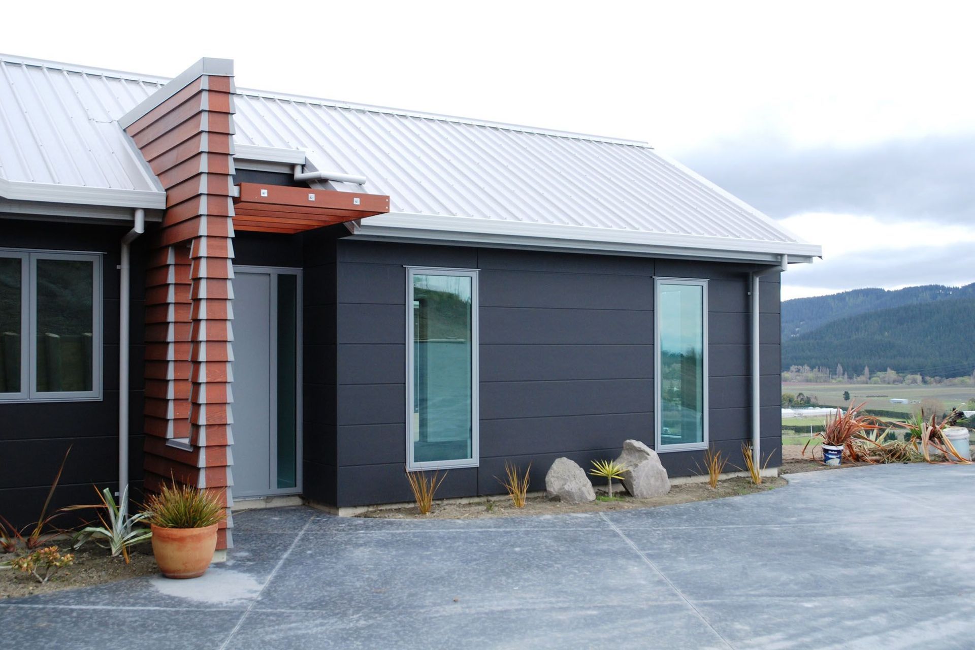 ArchiPro Project Summary - Watson's Residence is a charming cottage-style home in Pakowhai, featuring elegant siding and a beautifully designed roof, strategically positioned on a gentle slope.