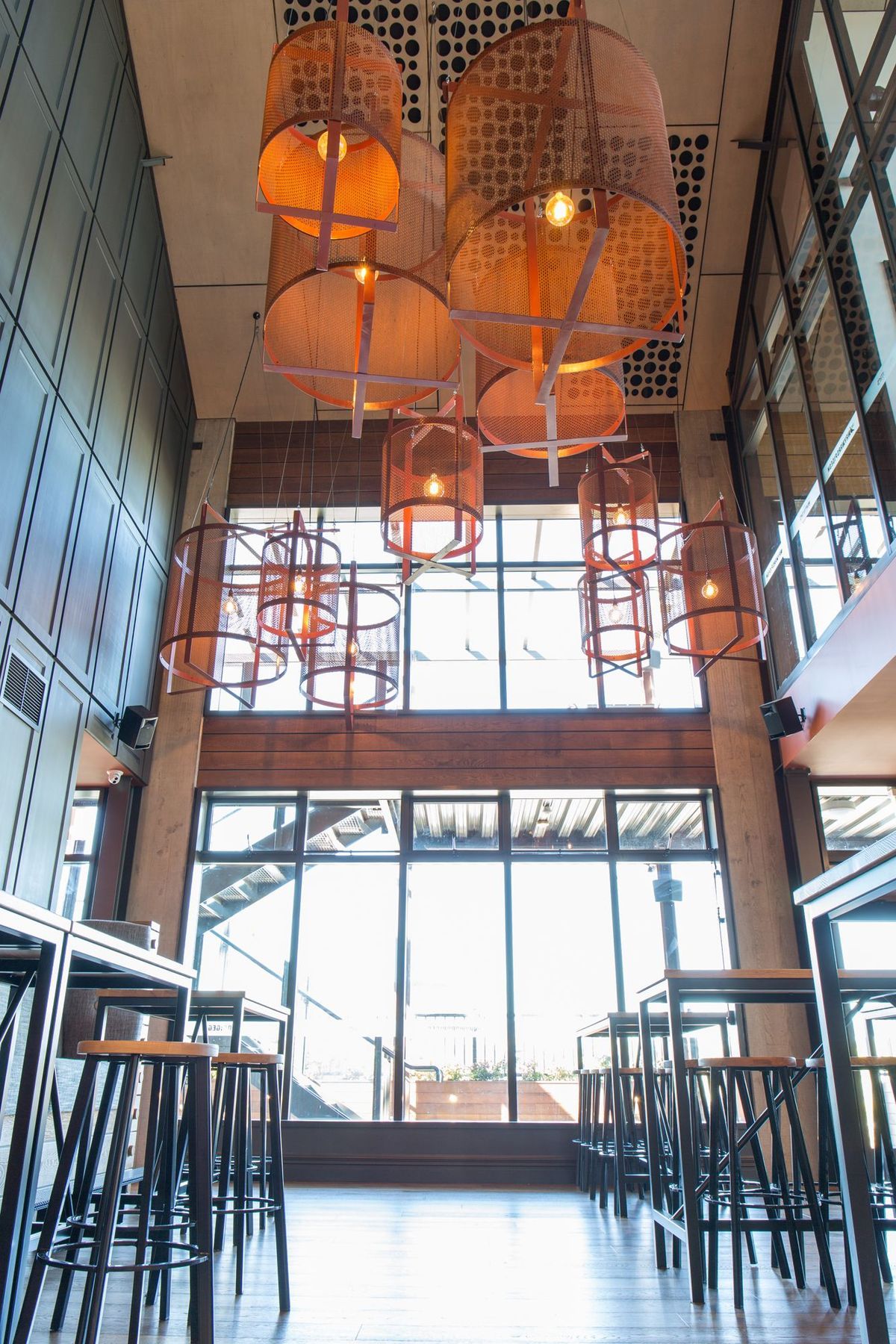 ArchiPro Project Summary - A thoughtfully designed venue featuring a central service space for efficient operations, complemented by a minimal color scheme and textured interiors, highlighted by custom light pendants that reflect Hamilton's natural landscape.
