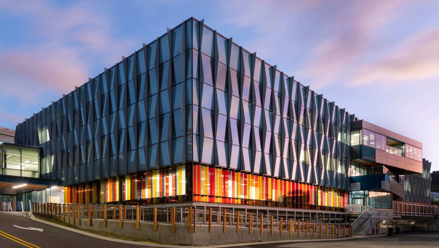 ArchiPro Project Summary - Wellington Regional Children's Hospital features innovative PW1000 Unitised Curtainwall with integrated solar shading, vibrant Vanceva Glass fins, and upcycled facade elements, creating a child-friendly environment while ensuring durability and performance.