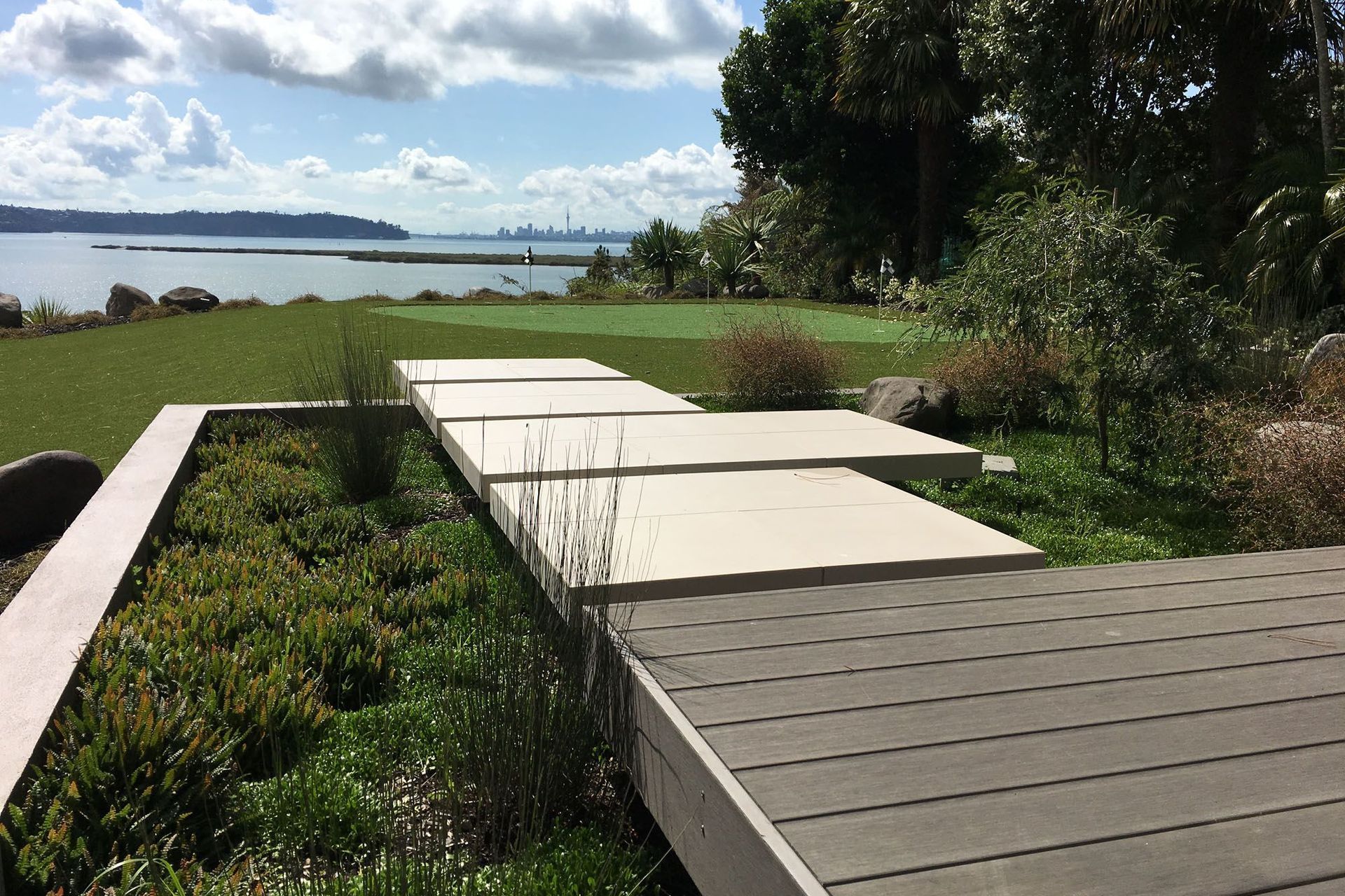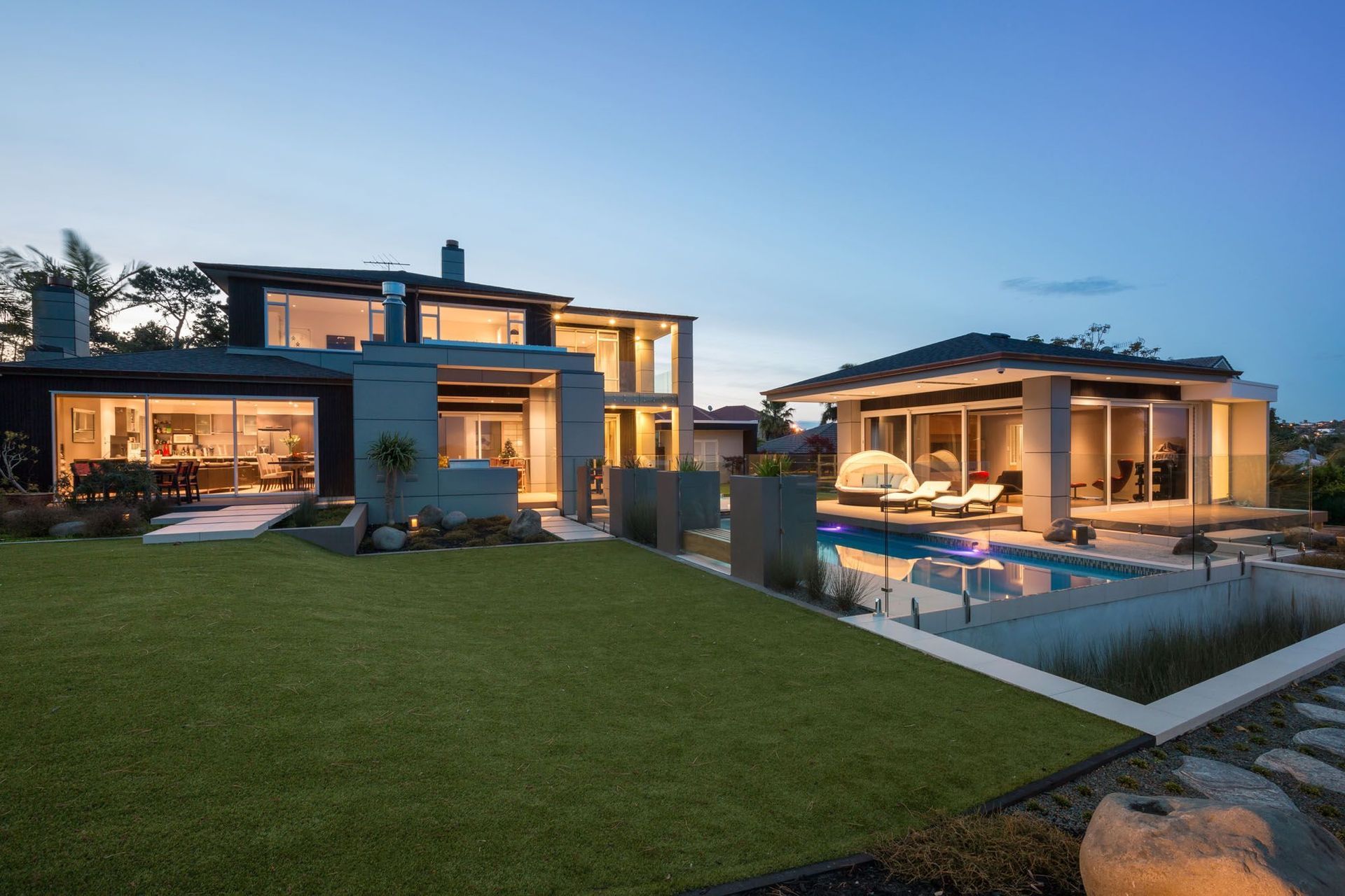 ArchiPro Project Summary - The West Harbour Home is a luxurious estate featuring landscaped gardens, a serene lawn, and views of a nearby golf course.