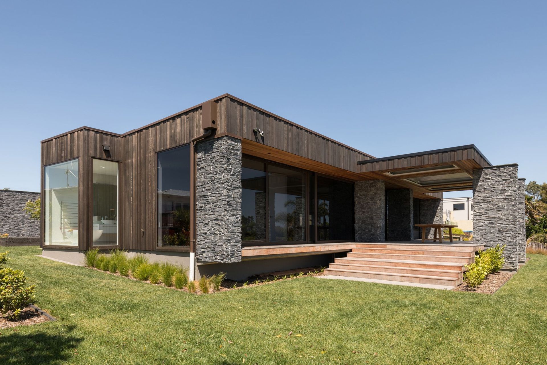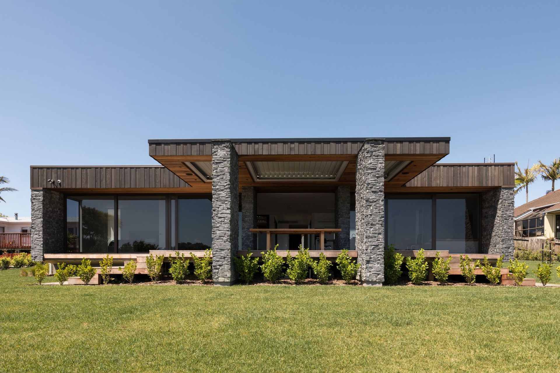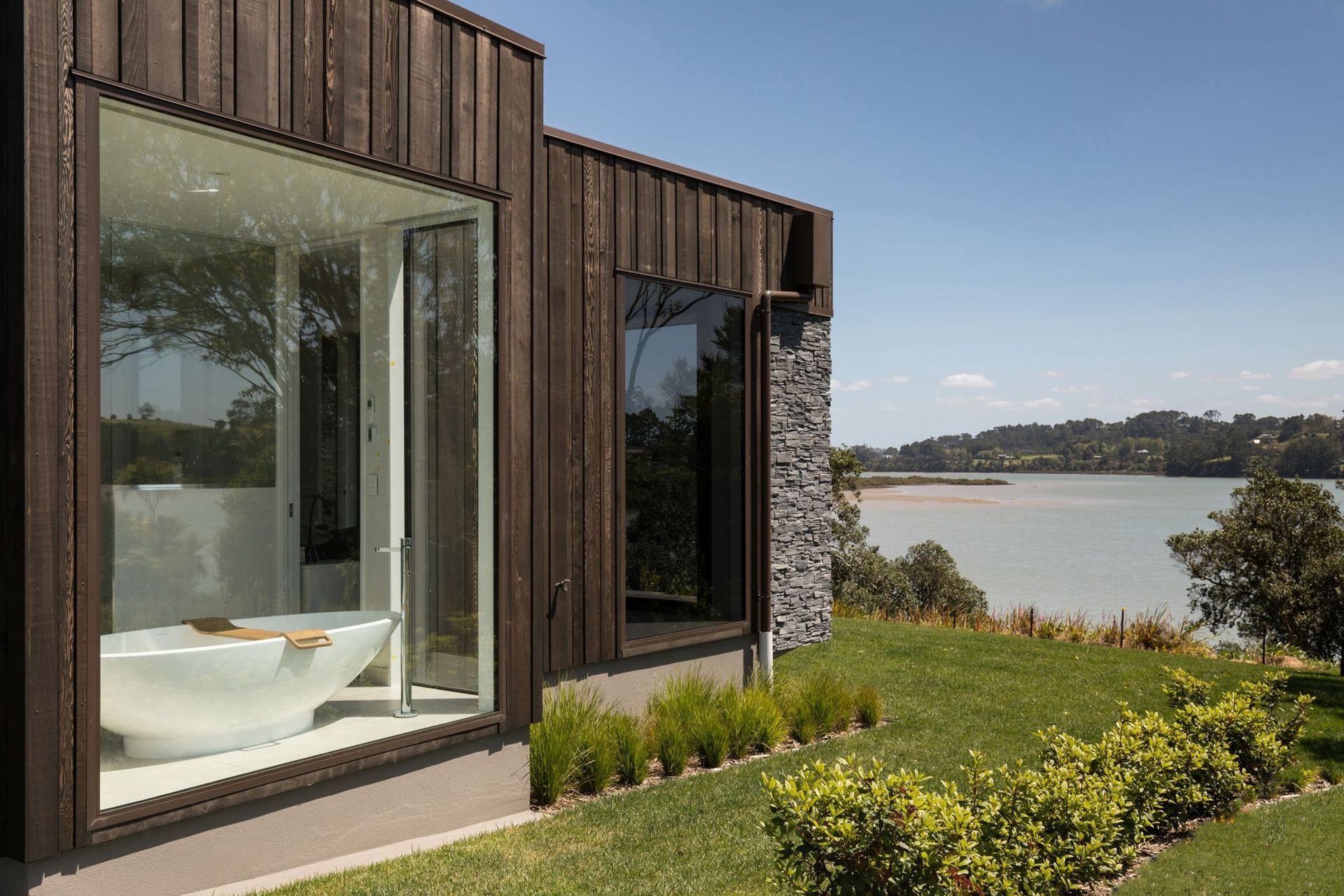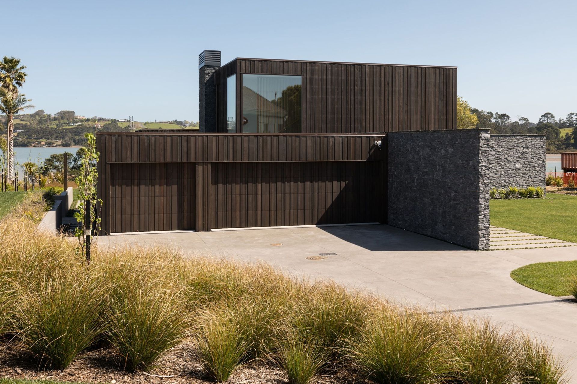 ArchiPro Project Summary - A luxurious contemporary residence in Whenuapai, featuring striking timber and stone exteriors, expansive glass walls with stunning water views, and meticulously designed interiors that blend elegance with comfort for an unparalleled living experience.