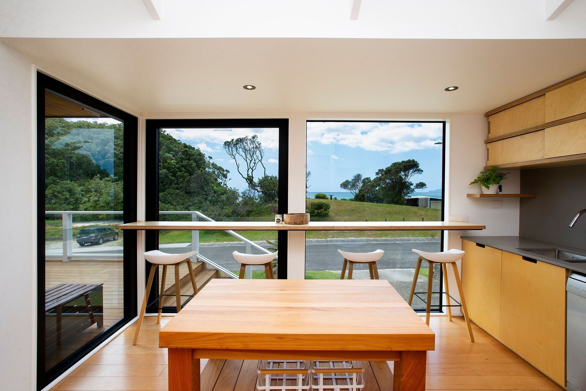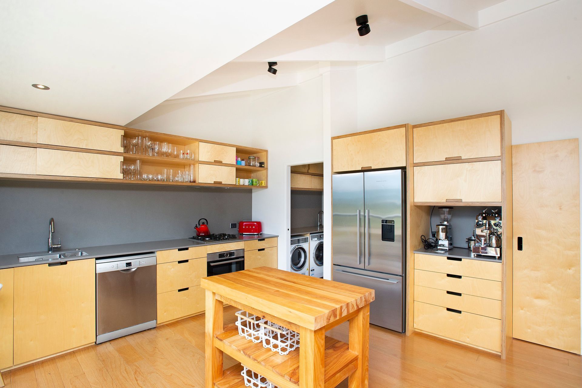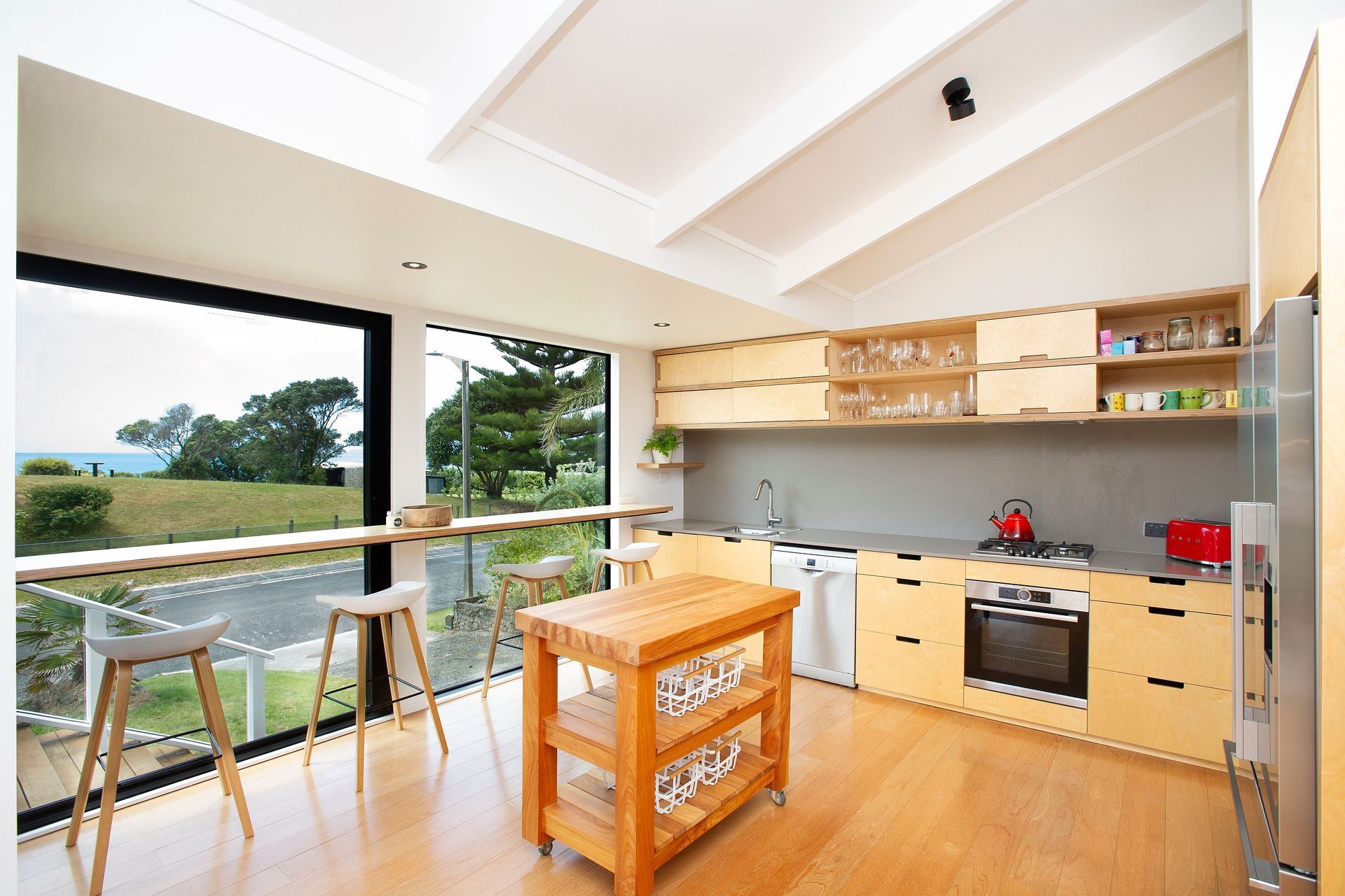 ArchiPro Project Summary - Contemporary kitchen featuring Birch ply construction, sealed with a UV-inhibiting matte finish, complemented by a floating top supported by a discreet steel structure, enhancing the aesthetic as you approach from the Whiritoa beachfront.