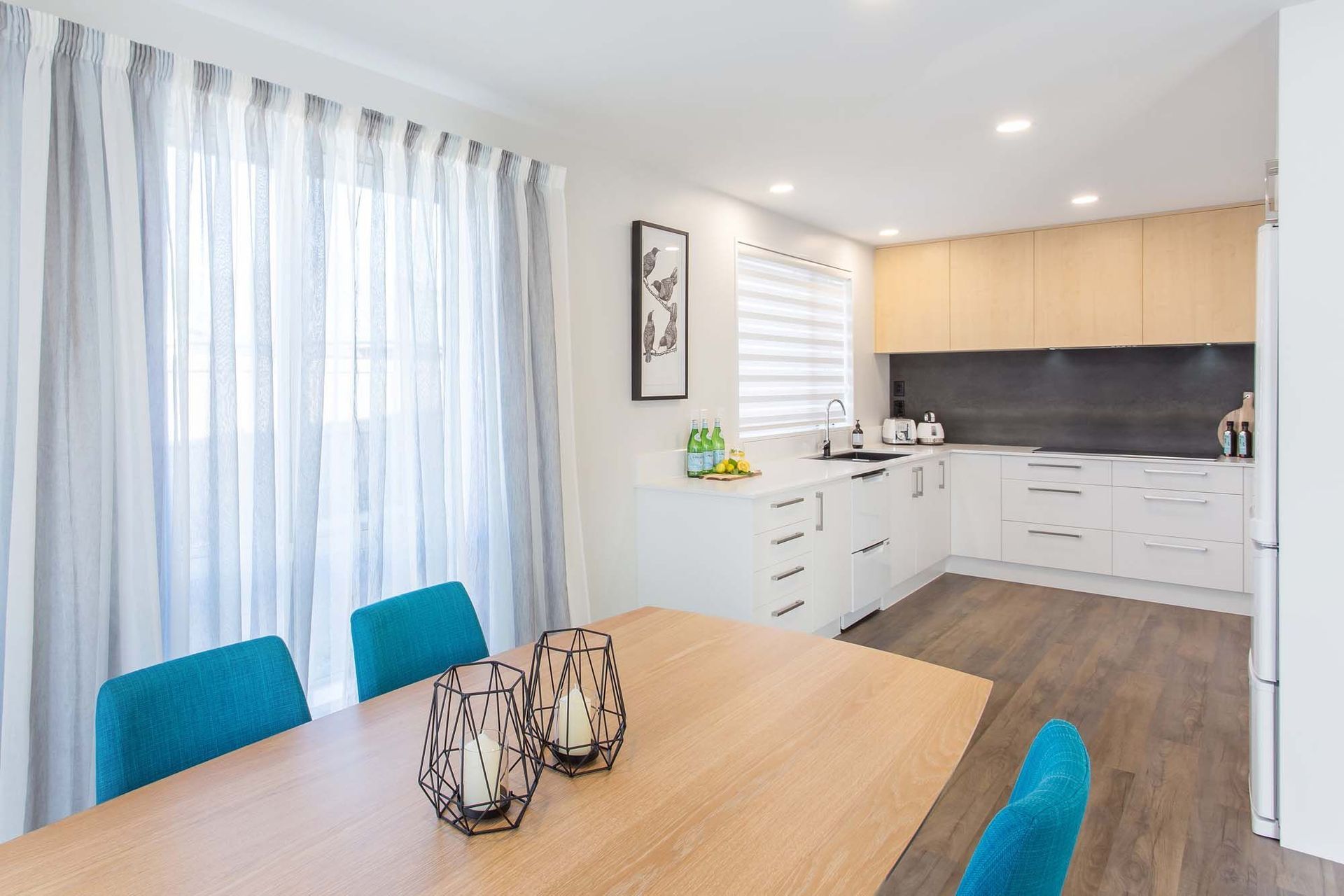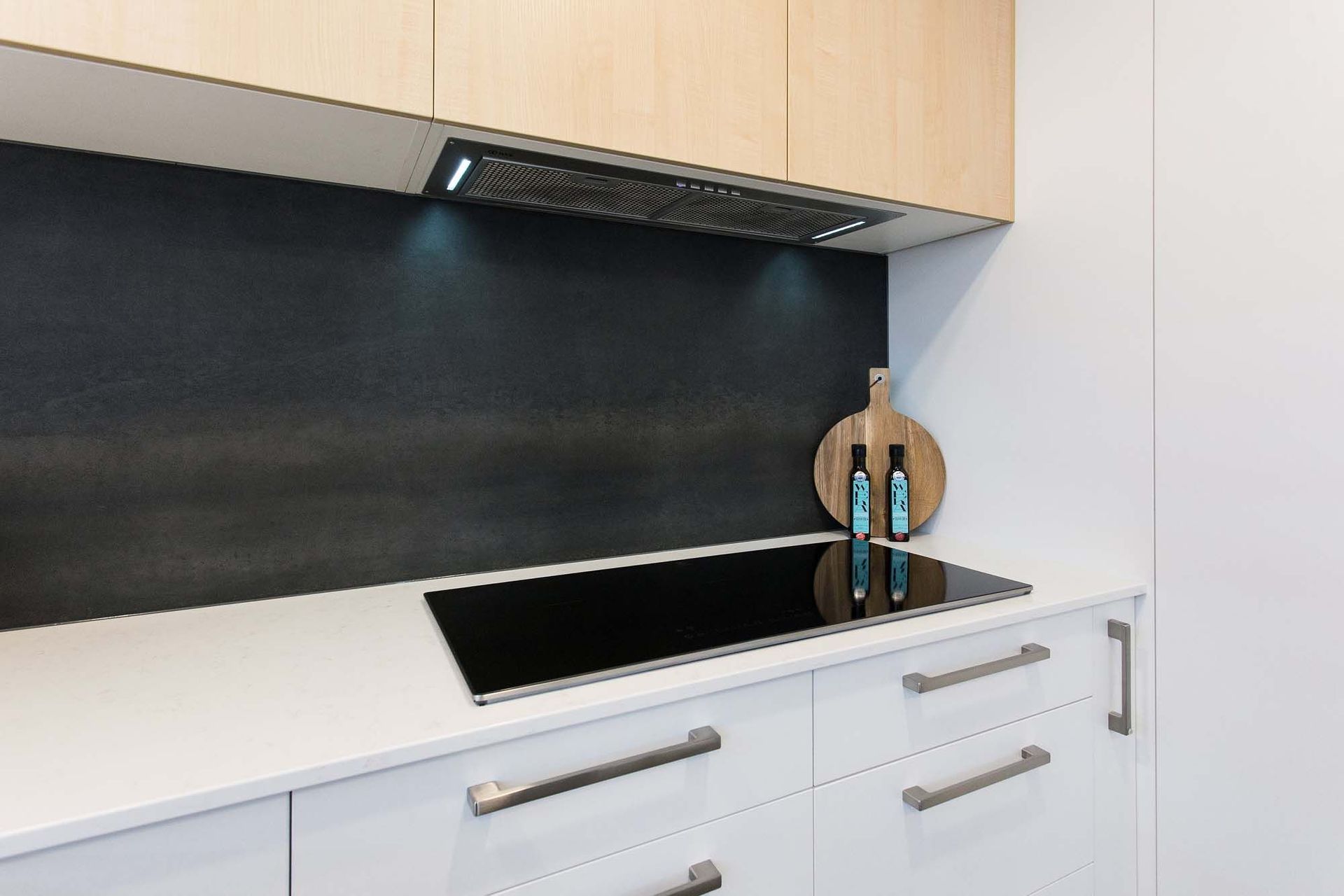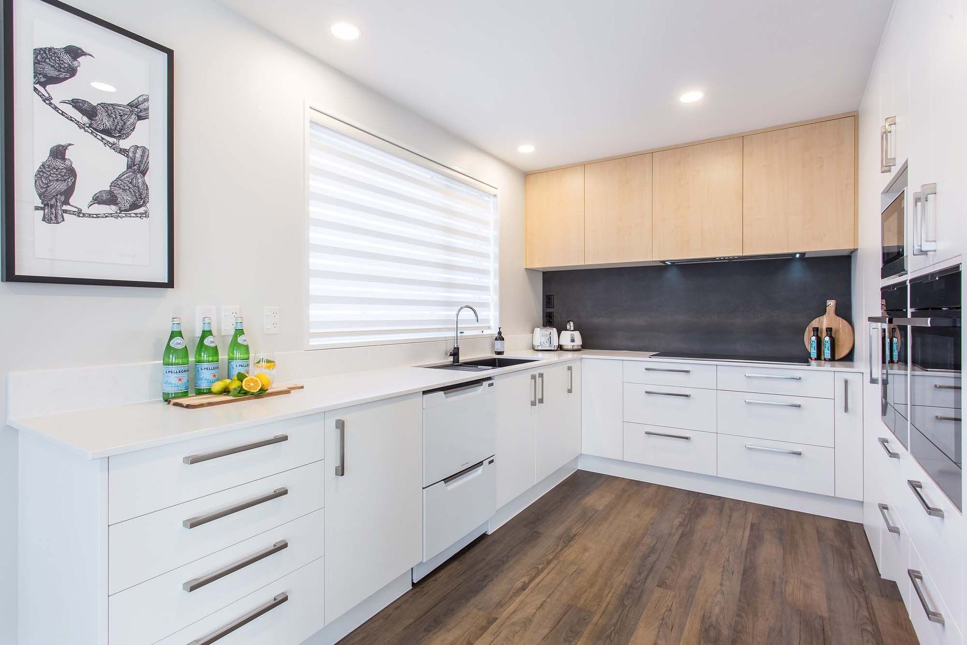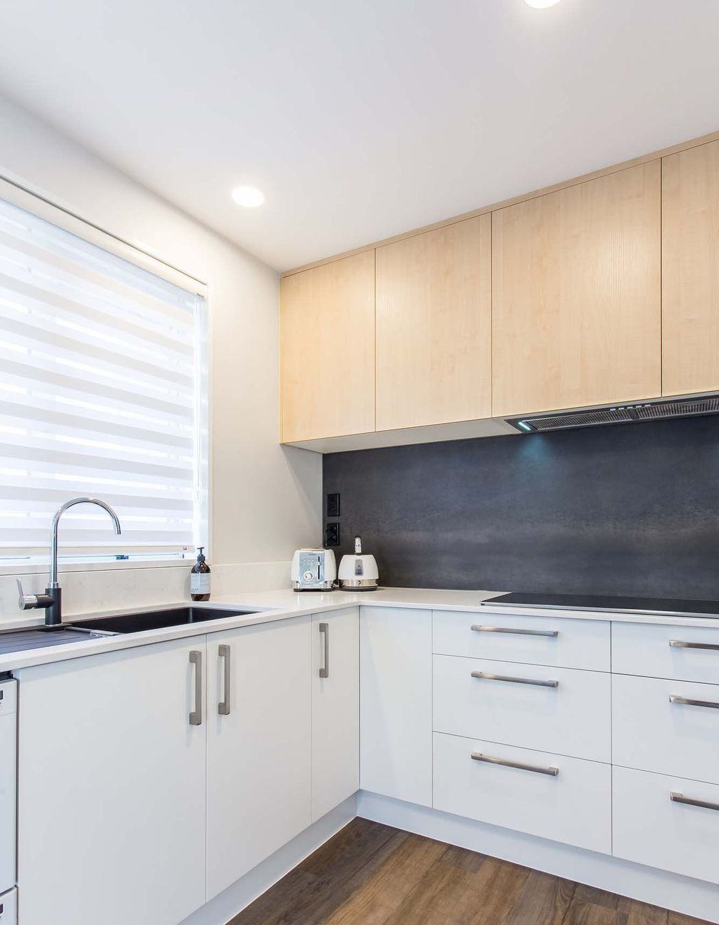 ArchiPro Project Summary - A stunning renovation that revitalizes an old kitchen into a bright, modern space featuring Touchtex doors in Arctic White and Best Maple, complemented by a striking charcoal splashback, designed and installed by Dream Doors Christchurch in Christchurch.