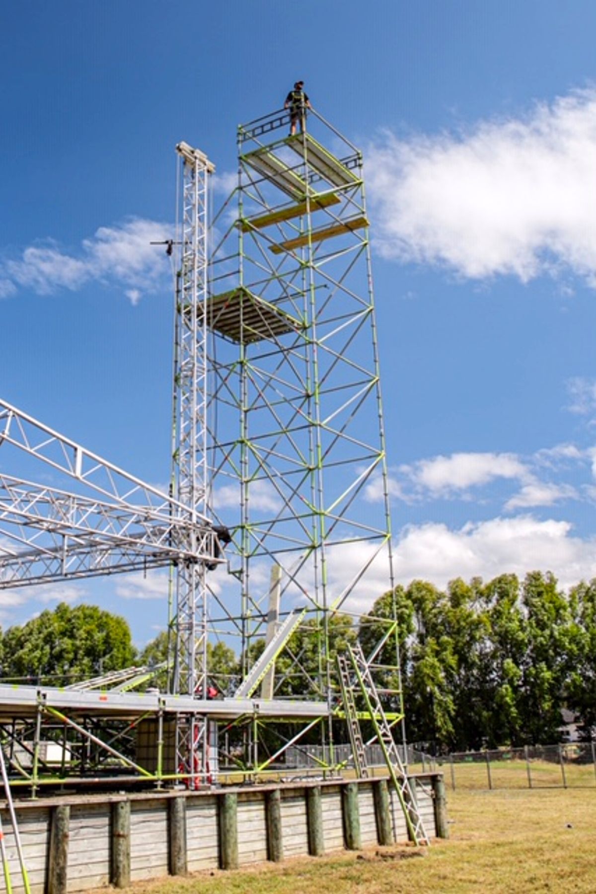 ArchiPro Project Summary - Whitianga Summer Concert 2020: A landmark event featuring a 20m x 18m stage, complete with PA towers, loading bay, and versatile Layher event system, ensuring a robust and weatherproof setup for an unforgettable anniversary celebration.