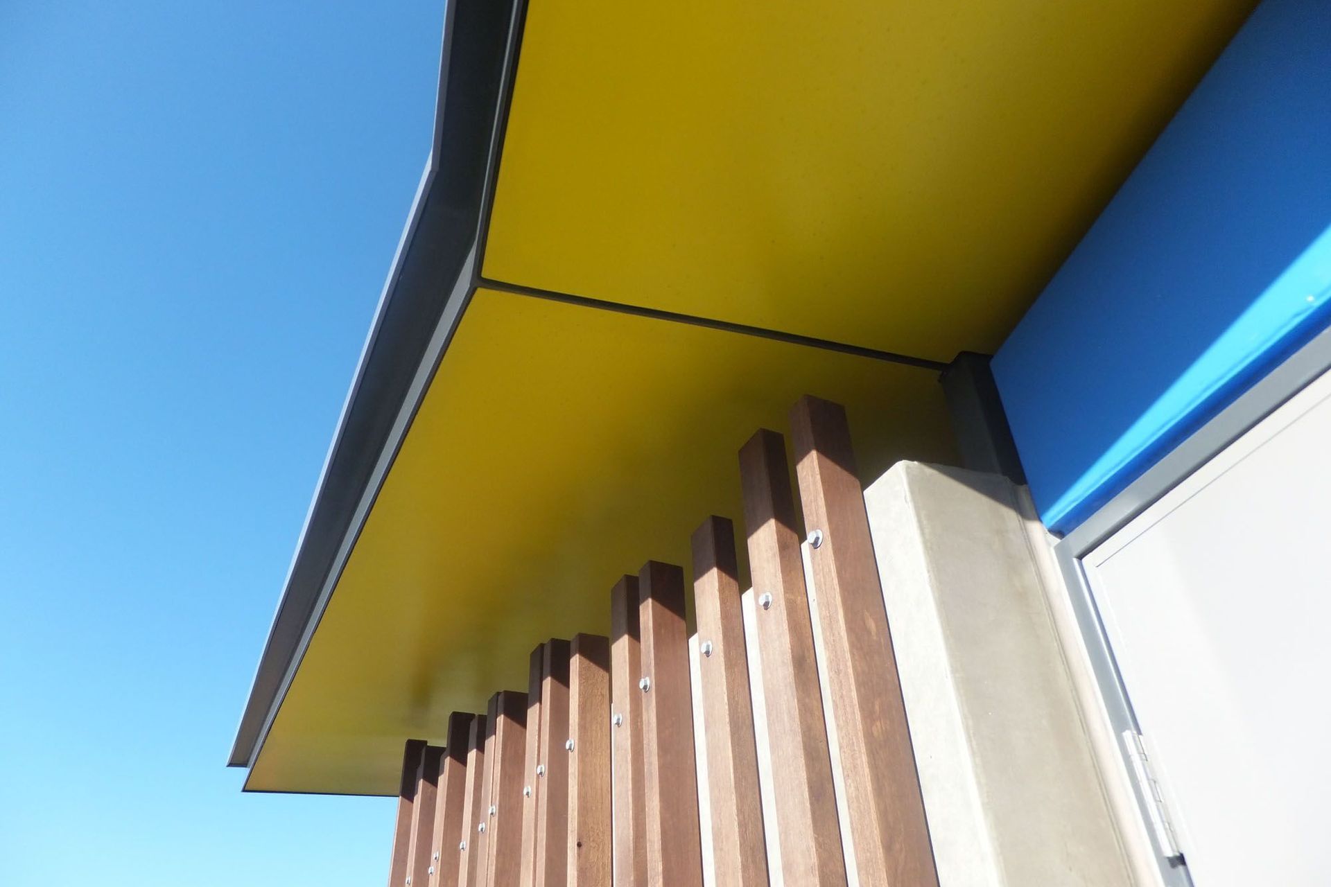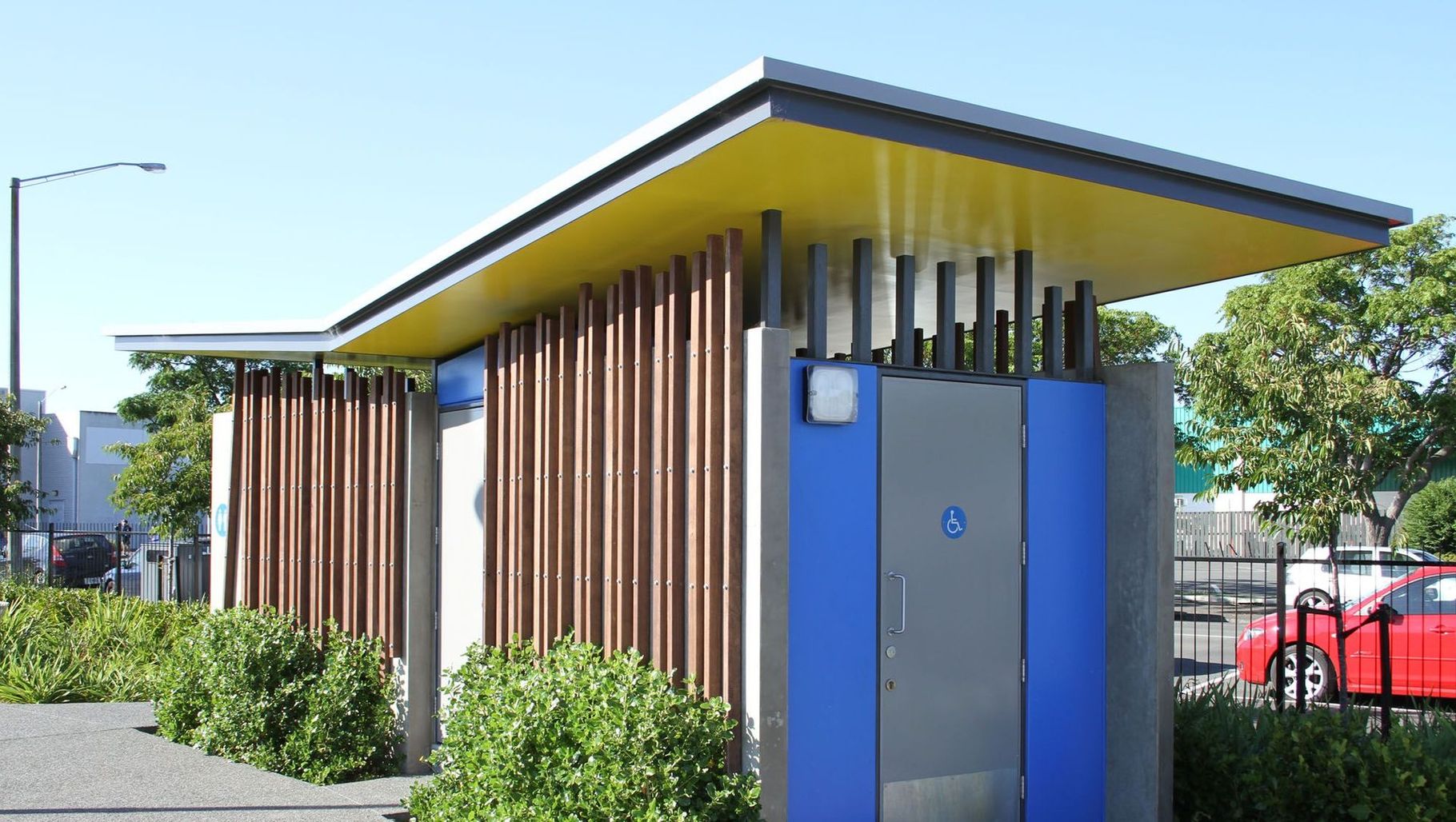 ArchiPro Project Summary - Innovative toilet facilities at William Nelson Park featuring angular precast concrete walls, an asymmetric butterfly roof, and vibrant color accents that enhance the park's dynamic atmosphere and connect with nearby playground equipment.