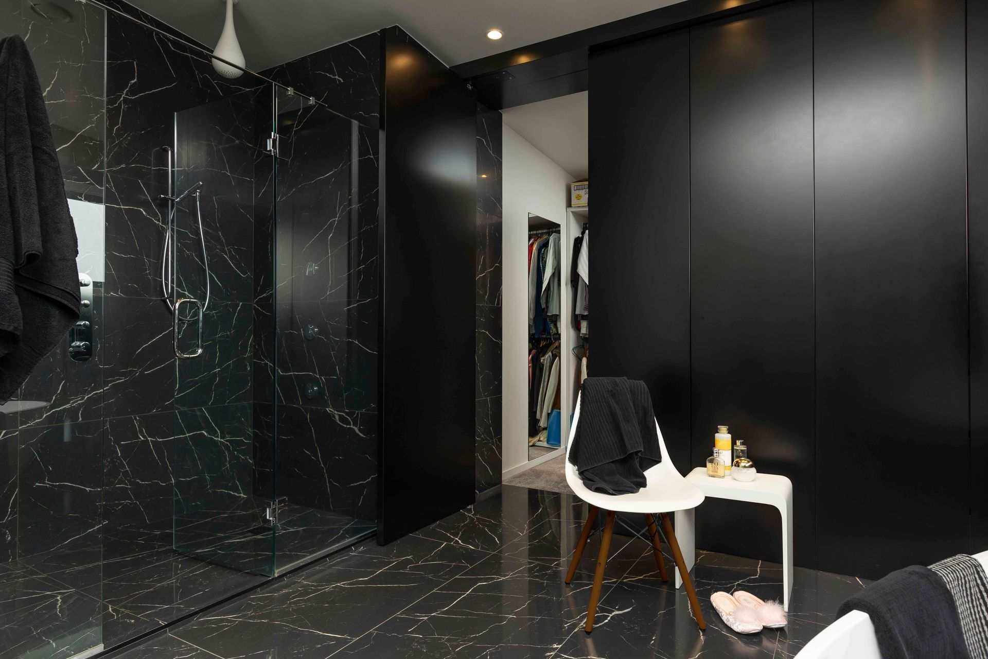ArchiPro Project Summary - A luxurious master ensuite featuring contemporary materials, innovative design elements, and ample storage, designed to provide a private yet accessible space for shared use, complete with a dual shower zone and a striking freestanding bathtub.