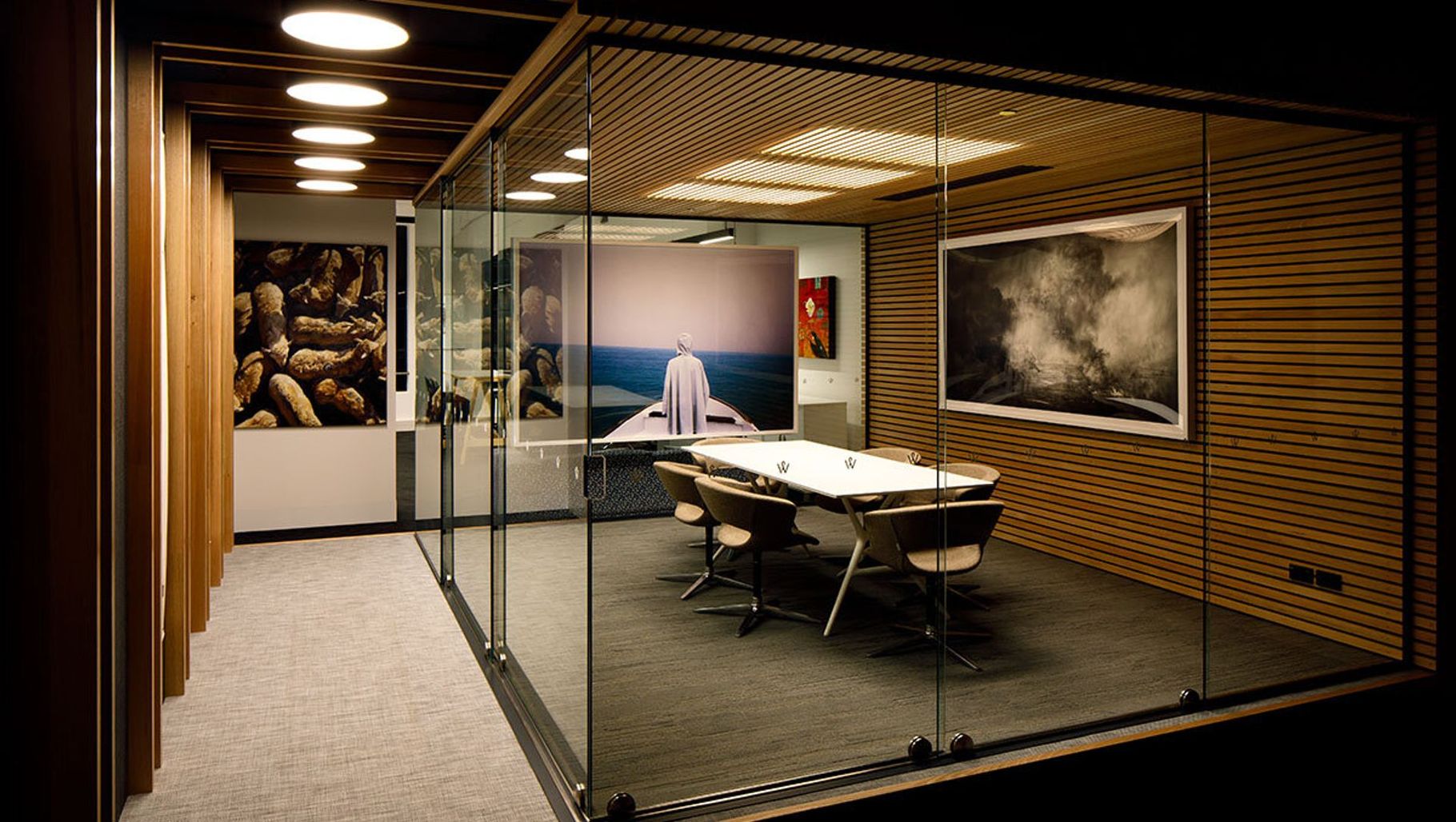 ArchiPro Project Summary - A versatile office and gallery space at The Woolstore Design Centre, Wellington, featuring a timber ‘box’ design and frameless glass meeting room doors that enhance functionality for both meetings and events.