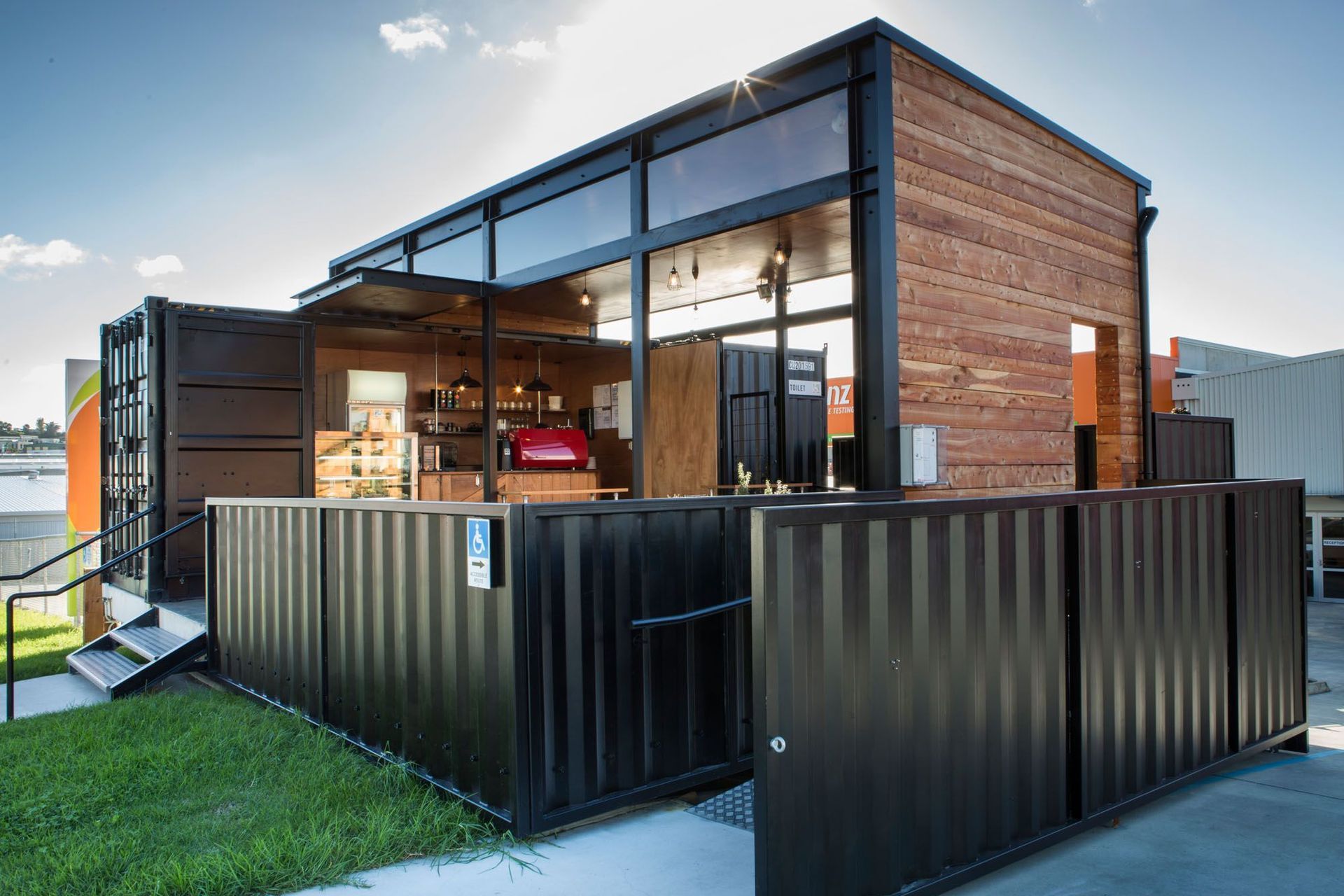 ArchiPro Project Summary - A welcoming kiosk-style cafe featuring a unique 'container within a container' design, utilizing repurposed shipping containers and a steel canopy to create a warm, inviting atmosphere while maintaining an industrial aesthetic.