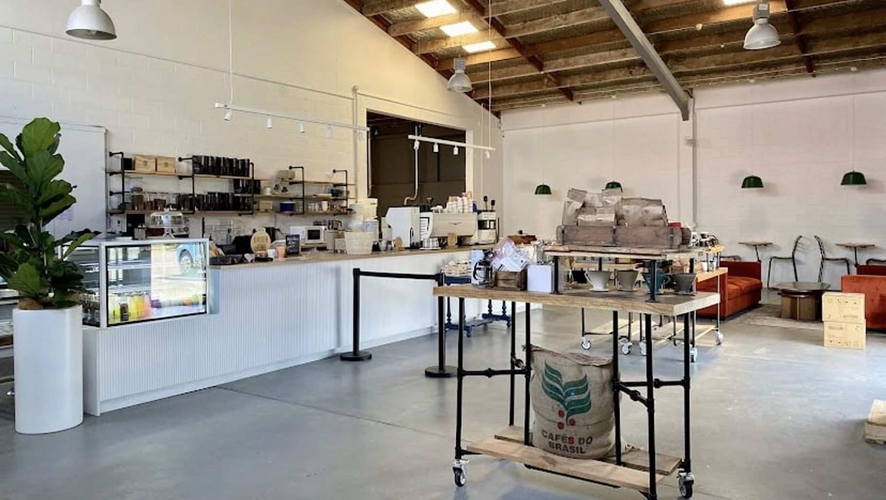 ArchiPro Project Summary - Industrial-style coffee roasting café featuring bespoke mobile display tables, wall-fixed café tables, and rustic shelving, completed in 2023 for Your Local Coffee Roasters.