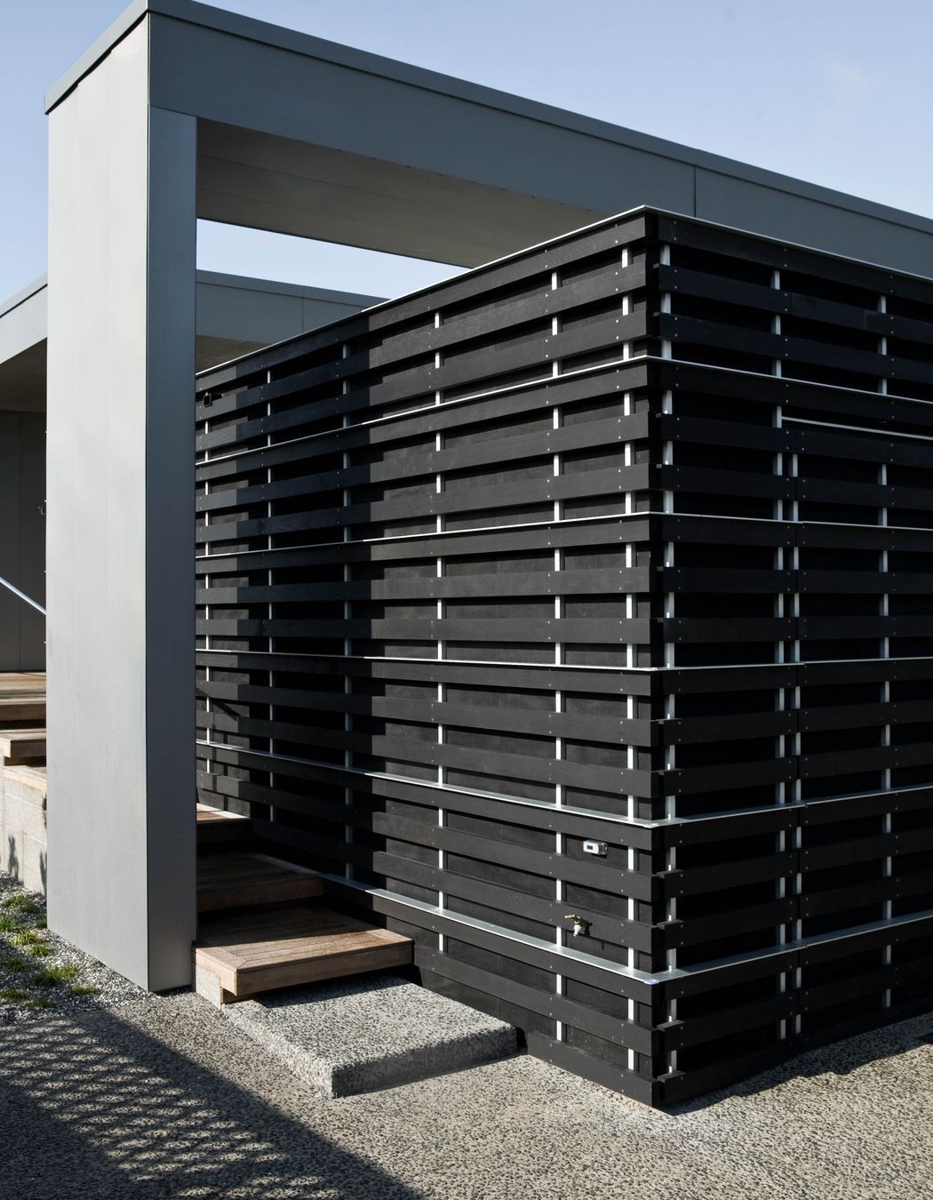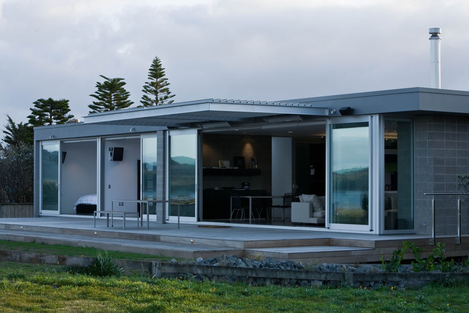 ArchiPro Project Summary - Coastal family bach featuring unobstructed views, low textured forms, and an open-plan layout with two sheltered courtyards, seamlessly transitioning to the beach.